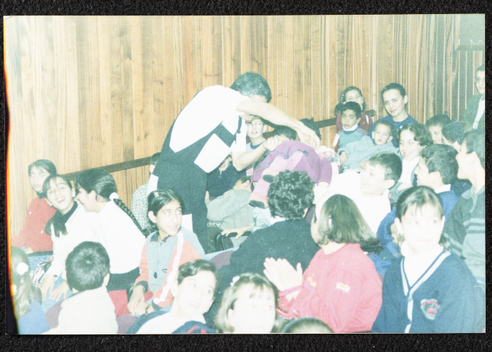 A photograph of al-Kasaba Theatre and Cinematheque's "The Golden Fish" puppet show in 1996. Adapted by al-Kasaba and directed by George Ibrahim, the play featured a cast of Palestinian actors, including Husam abu-ʿEisha and Georgina Aṣfur.