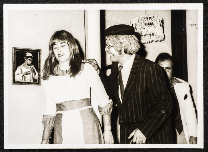 Taken in 1977 at al-Kasaba Theatre and Cinematheque, this black-and-white photograph captures a freeze of George Ibrahim's adaptation of Pierre de Beaumarchais's play, "Who Mocks Who?". Directed by Ibrahim, the performance featured a cast of Palestinian actors, including George Ibrahim, Jackie Ayyoub, Bassam Zuʿmut, Mahmoud ʿawad, Jawad Risheq, and Jamal Isʿayed.