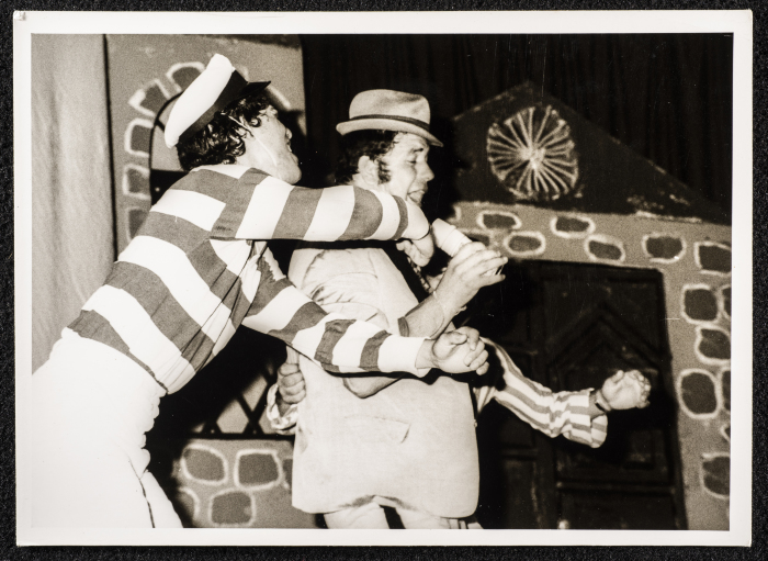 Taken in 1977 at al-Kasaba Theatre and Cinematheque, this black-and-white photograph captures a freeze of George Ibrahim's adaptation of Pierre de Beaumarchais's play, "Who Mocks Who?". Directed by Ibrahim, the performance featured a cast of Palestinian actors, including George Ibrahim, Jackie Ayyoub, Bassam Zuʿmut, Mahmoud ʿawad, Jawad Risheq, and Jamal Isʿayed.