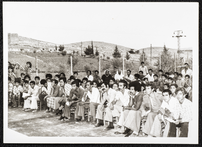 Taken in 1977 at al-Kasaba Theatre and Cinematheque, this black-and-white photograph captures a freeze of George Ibrahim's adaptation of Pierre de Beaumarchais's play, "Who Mocks Who?". Directed by Ibrahim, the performance featured a cast of Palestinian actors, including George Ibrahim, Jackie Ayyoub, Bassam Zuʿmut, Mahmoud ʿawad, Jawad Risheq, and Jamal Isʿayed.