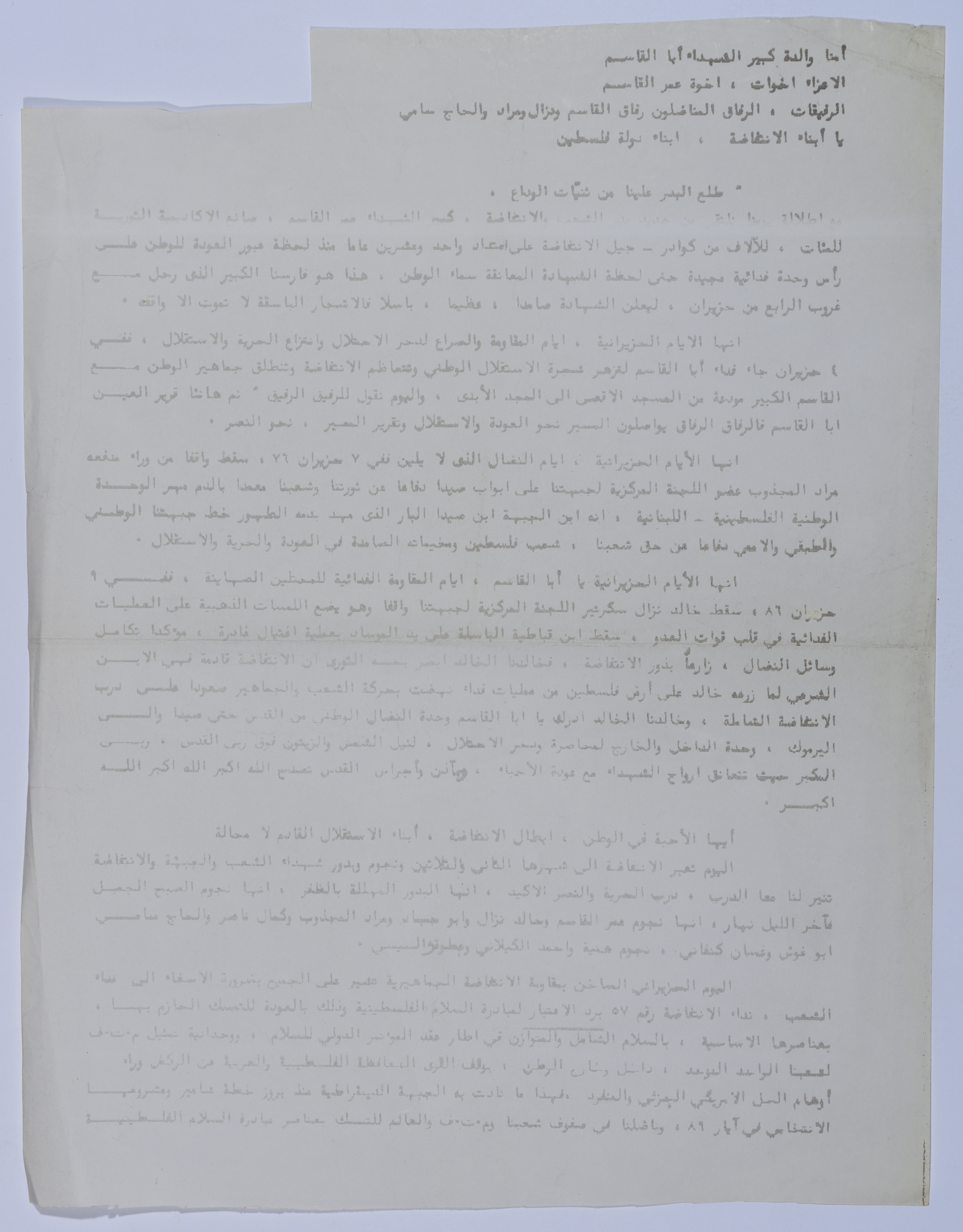 A Letter of Condolences Sent to the Family of Omar al-Qasim, 1989