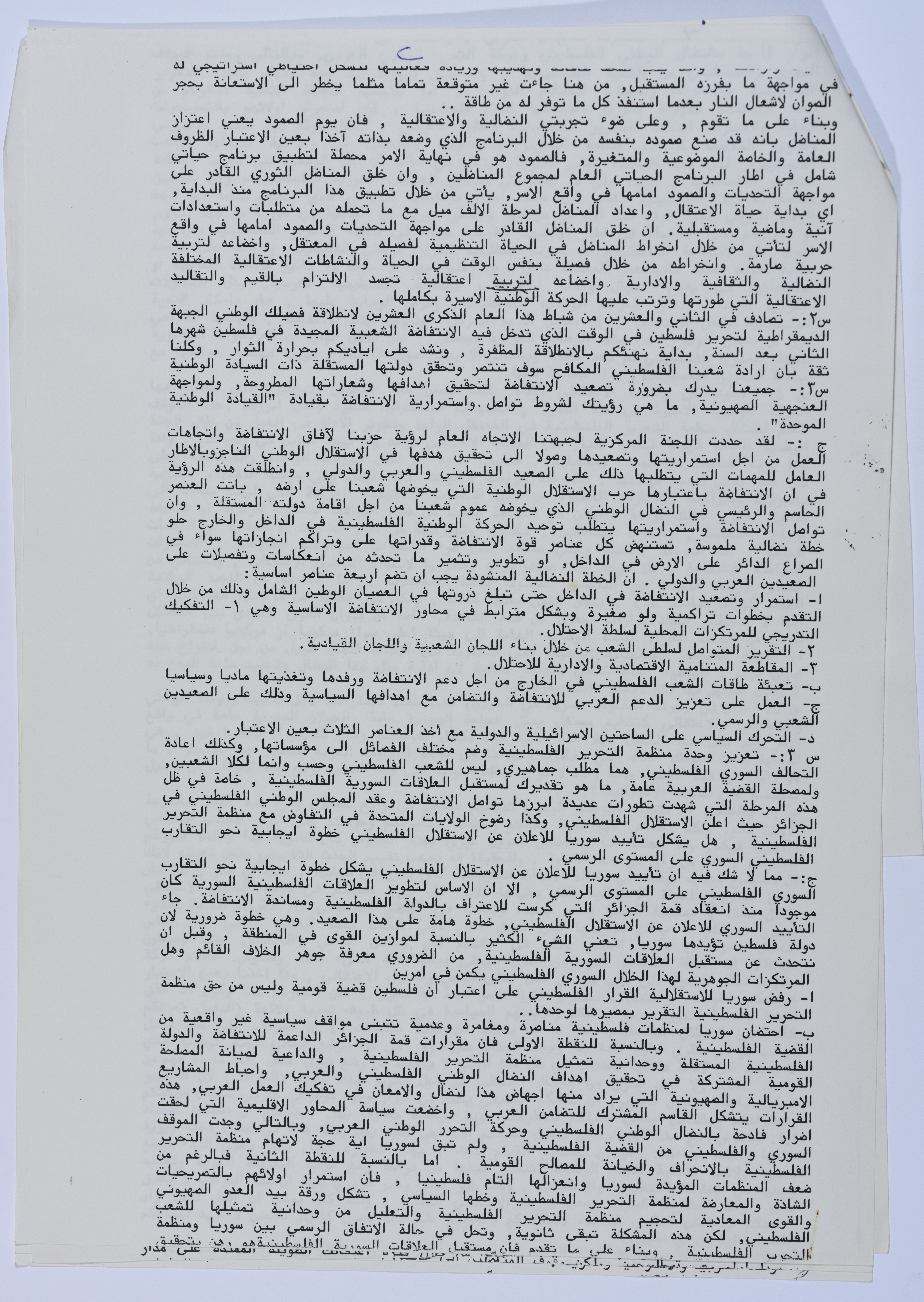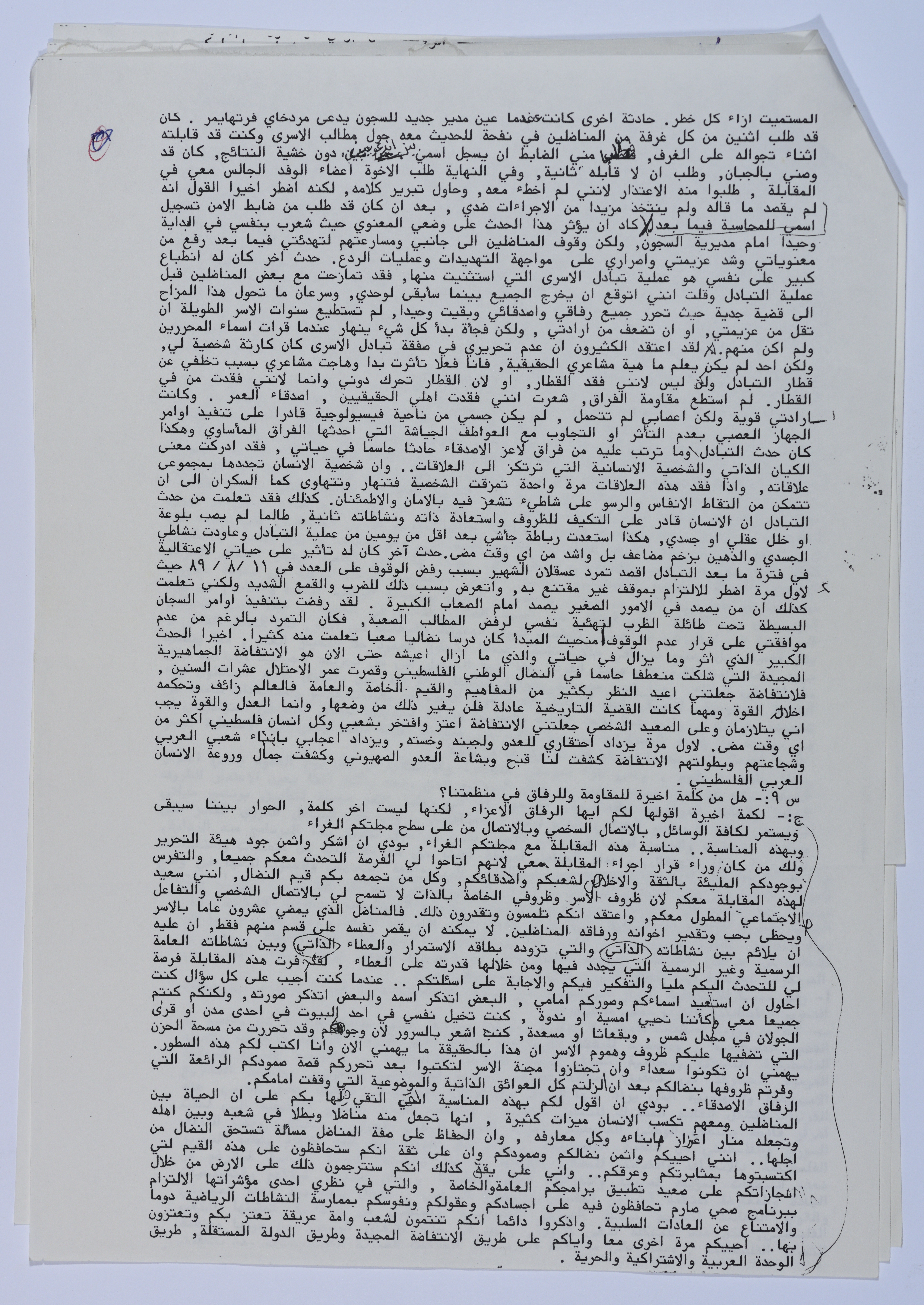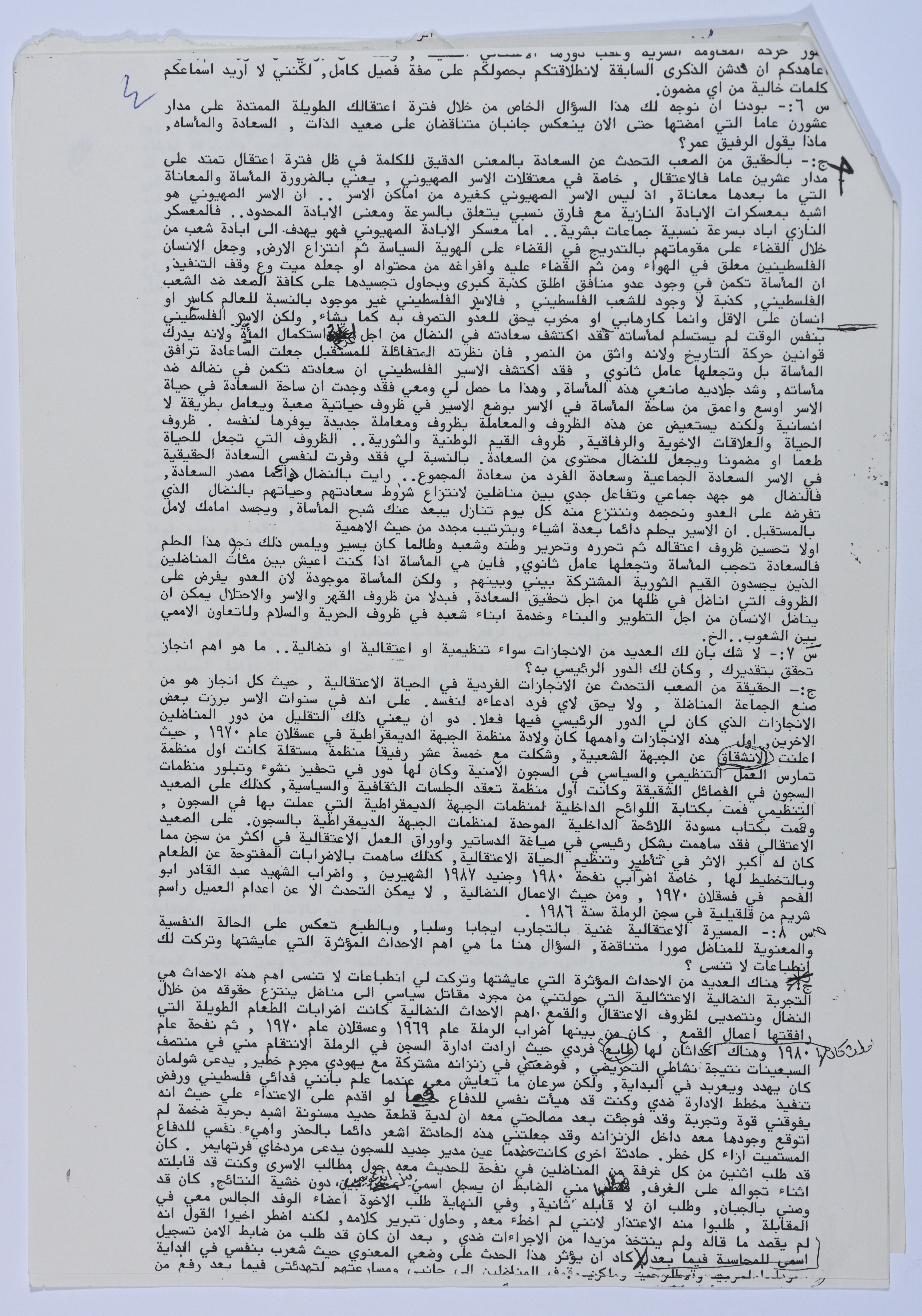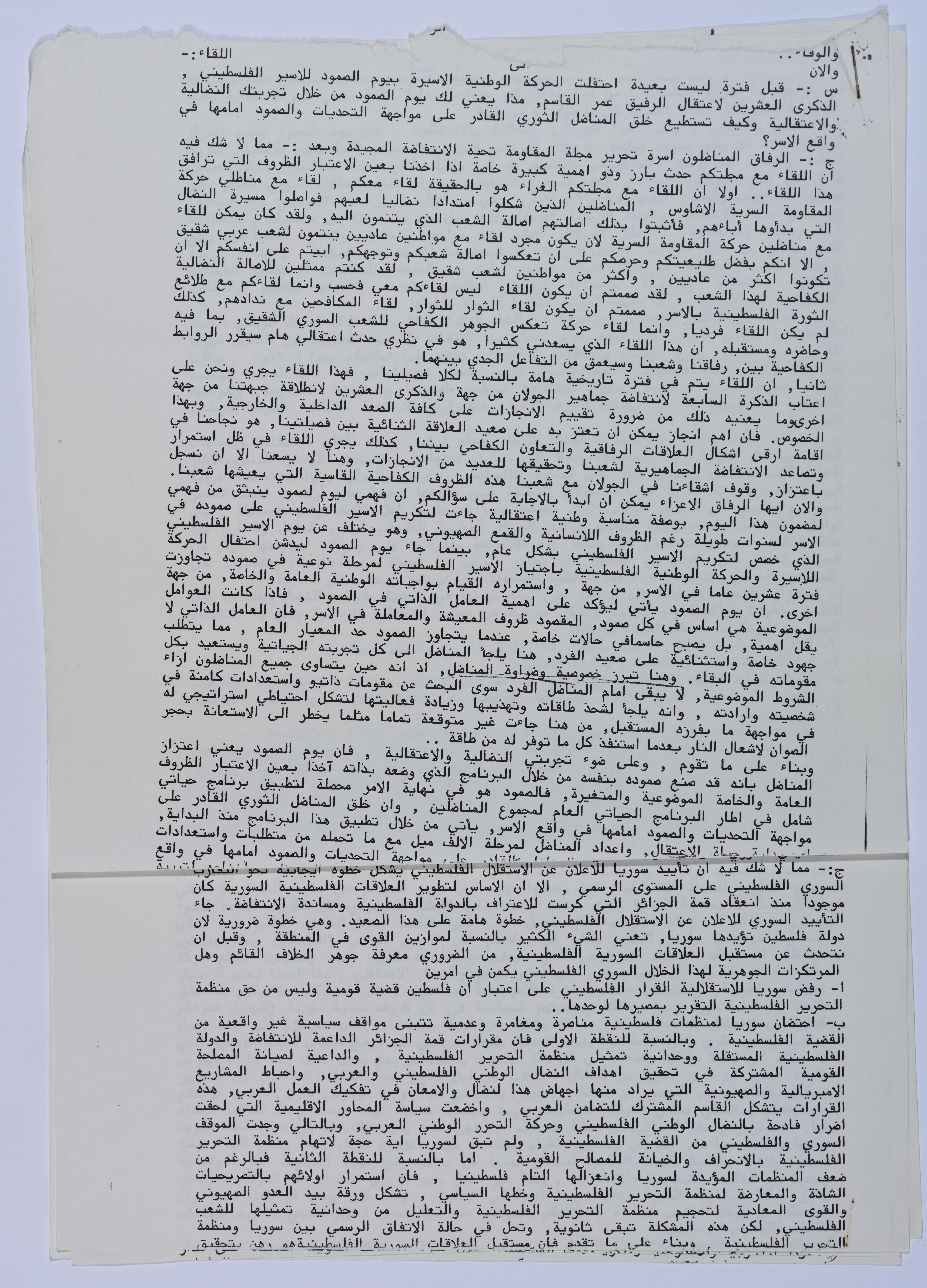 This document shows pages from a magazine that published an interview from prison with Omar al-Qasim on the 20th anniversary of his arrest in 1988. During the interview, al-Qasim answered several questions about the reality of detention for prisoners and the political and organizational situation in general during the first Intifada.