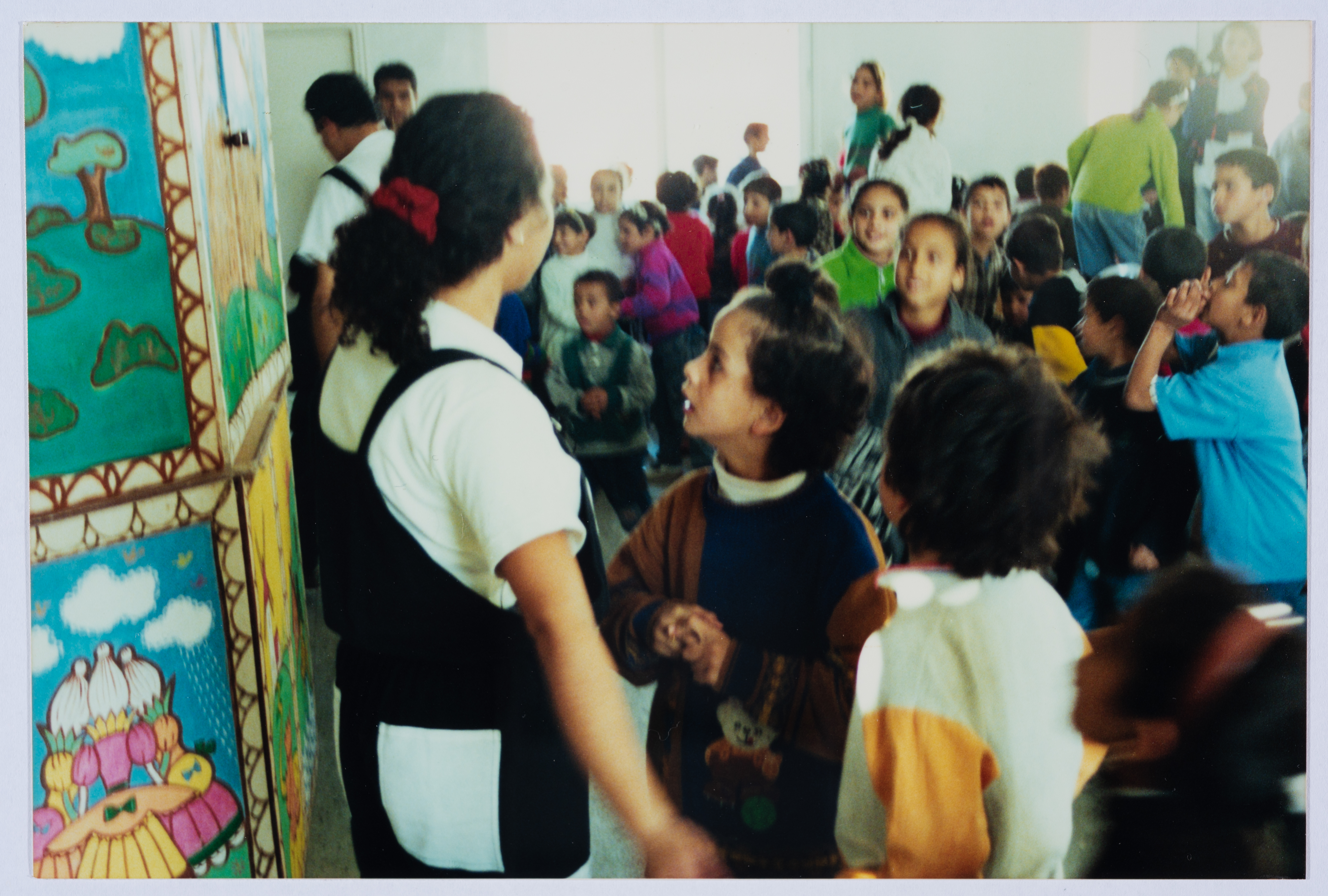 Taken in 1996, this colour photograph captures a freeze of al-Kasaba Theatre and Cinematheque's children theatre production, "The Golden Fish". This play starred two casts. The first cast performed the play in al-Quds (Jerusalem), starring Husam abu ʿaysha, Georgina ʿṣfur. The second performance was in Ramallah, starring Amira Habash and Firas abu Ṣabah.