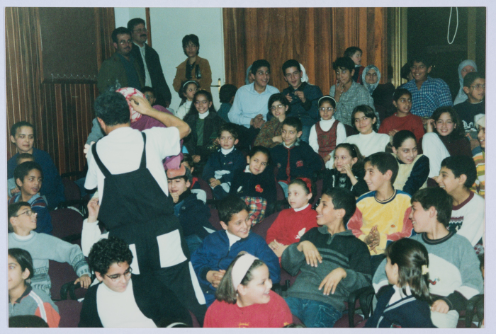 Taken in 1996, this colour photograph captures a freeze of al-Kasaba Theatre and Cinematheque's children theatre production, "The Golden Fish". This play starred two casts. The first cast performed the play in al-Quds (Jerusalem), starring Husam abu ʿaysha, Georgina ʿṣfur. The second performance was in Ramallah, starring Amira Habash and Firas abu Ṣabah.