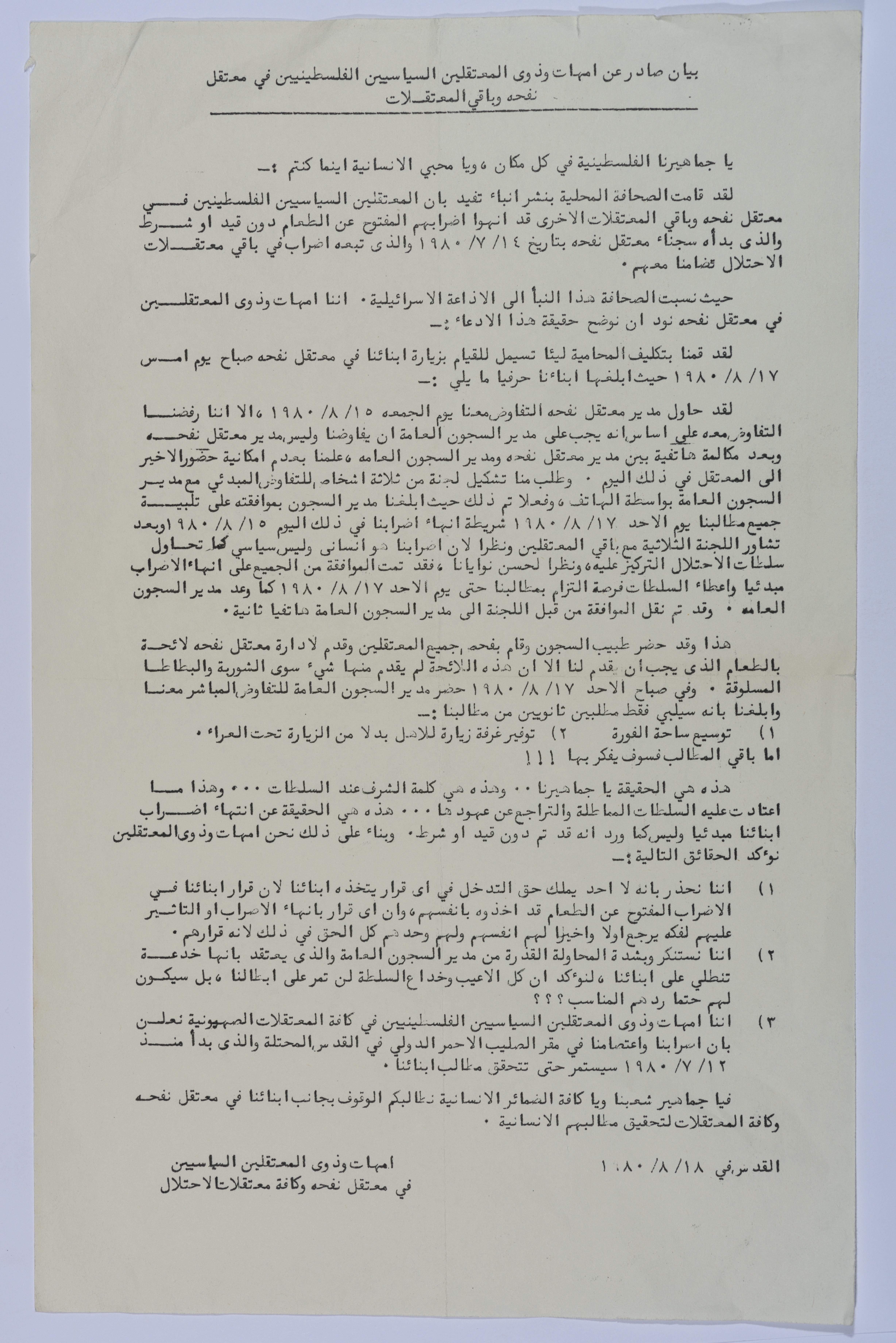 Issued on 18 August 1980, this document shows a statement by the families and mothers of Palestinian detainees in Nafha Prison regarding their children's food strike.