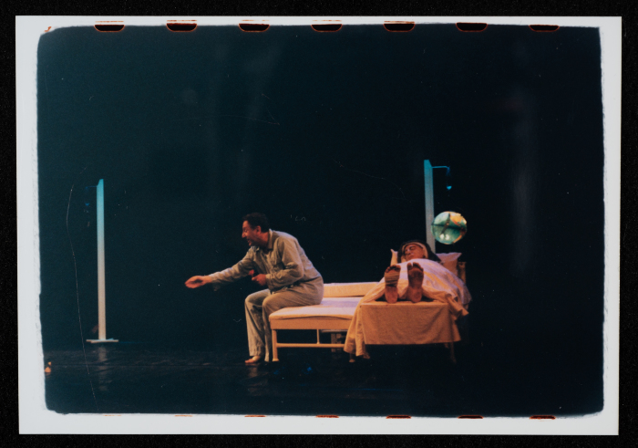 Taken in 2000 at the opening of al-Kasaba Theatre and Cinematheque premises in Ramallah, this colour photograph captures a freeze of "Bab Shams" play. Based on Elias Khury's novel, "Bab al-Shams", George Ibrahim wrote this monodrama starring Makram Khury.