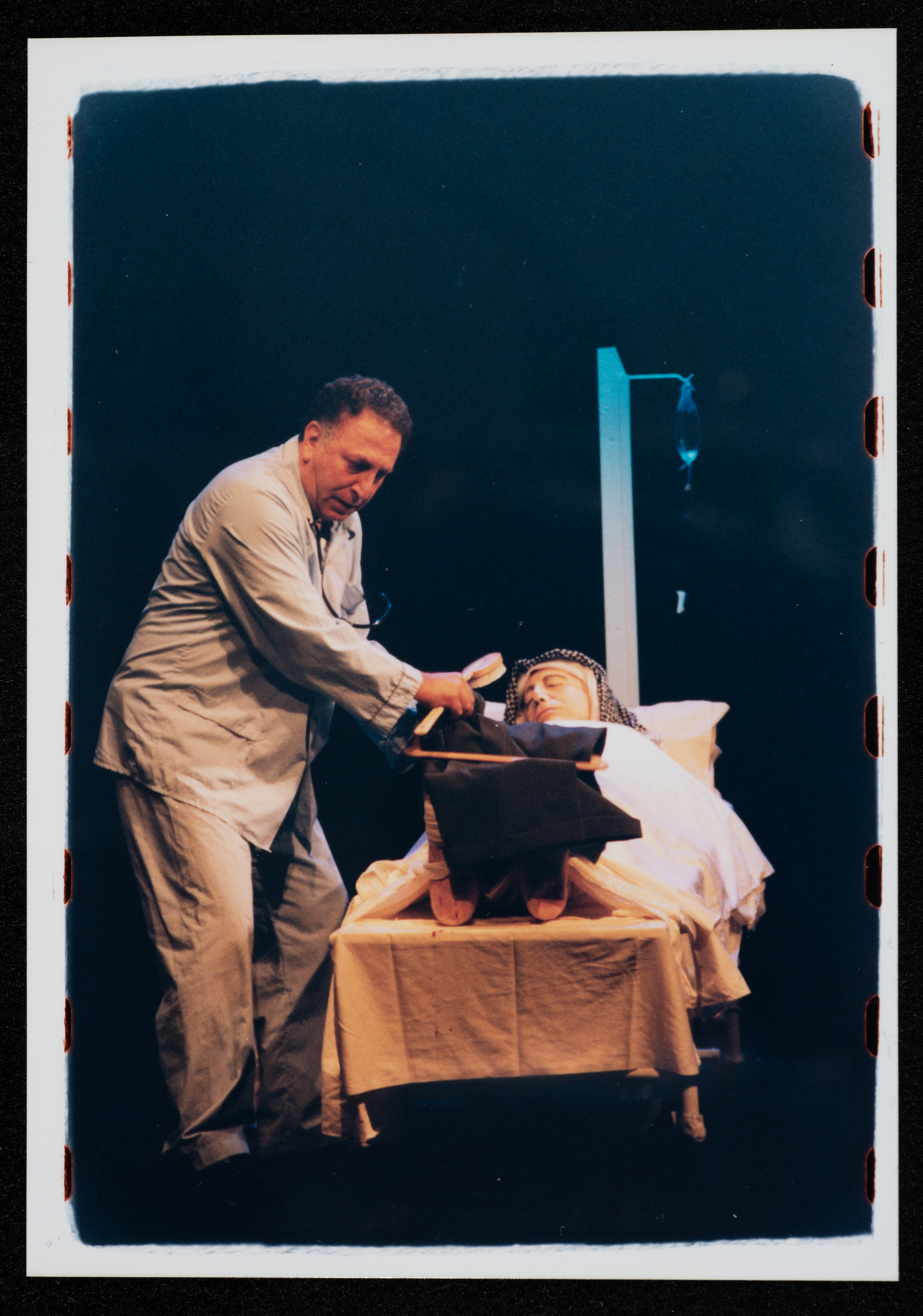 Taken in 2000 at the opening of al-Kasaba Theatre and Cinematheque premises in Ramallah, this colour photograph captures a freeze of "Bab Shams" play. Based on Elias Khury's novel, "Bab al-Shams", George Ibrahim wrote this monodrama starring Makram Khury.