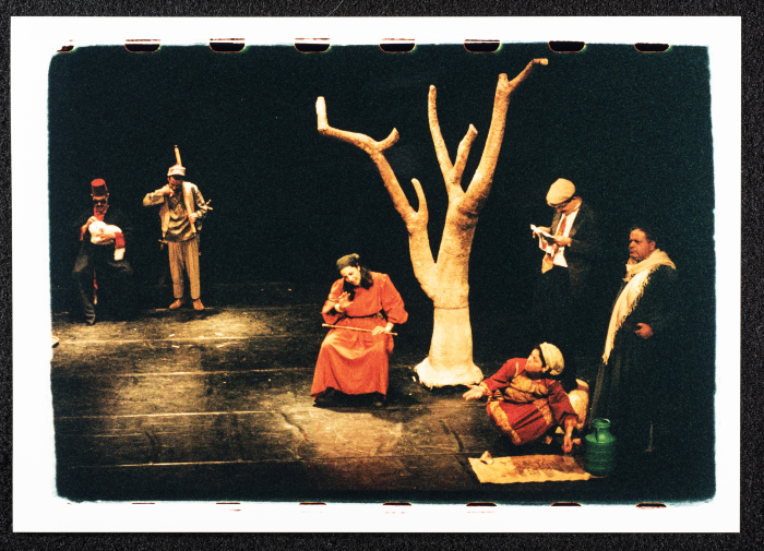Taken in 1997, this colour photograph captures a freeze of al-Kasaba Theater and Cinematheque's play, "al-Mahajir" [the immigrant]. Directed by Muhammad Mekhmas, the play ran in Jerusalem, Galilee, Jordan, Syria, and Tunisia, featuring a cast of Palestinian actors, including Muhammad al-Bakry, Makram Khury, Mahmud ʿawad, Khalid al-Maṣu, Walid ʿabdelsalam, George Ibrahim, Salwa Naqara, ʿarin ʿumary, Husam abu ʿaysha, and Bassam Zuʿmut.