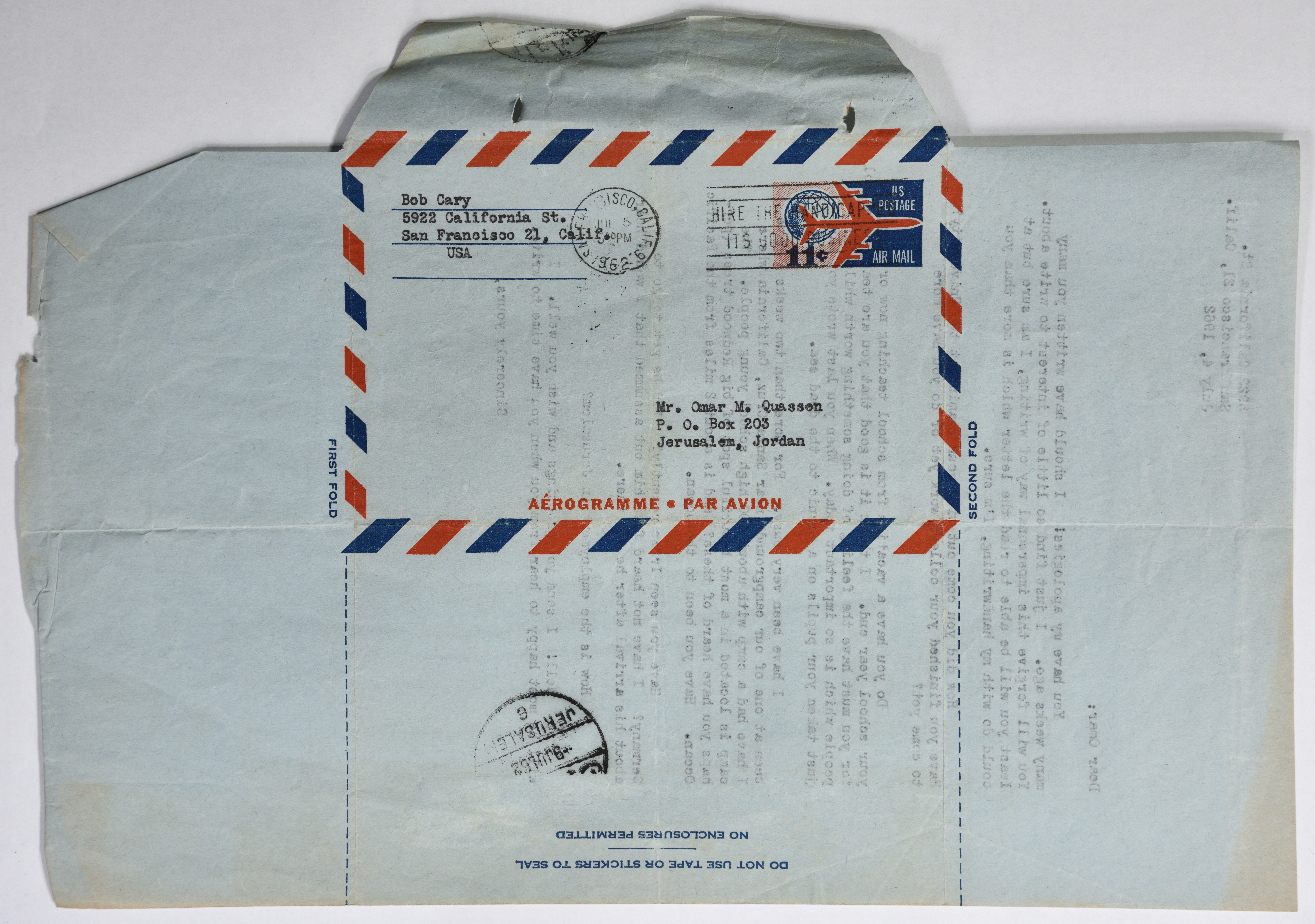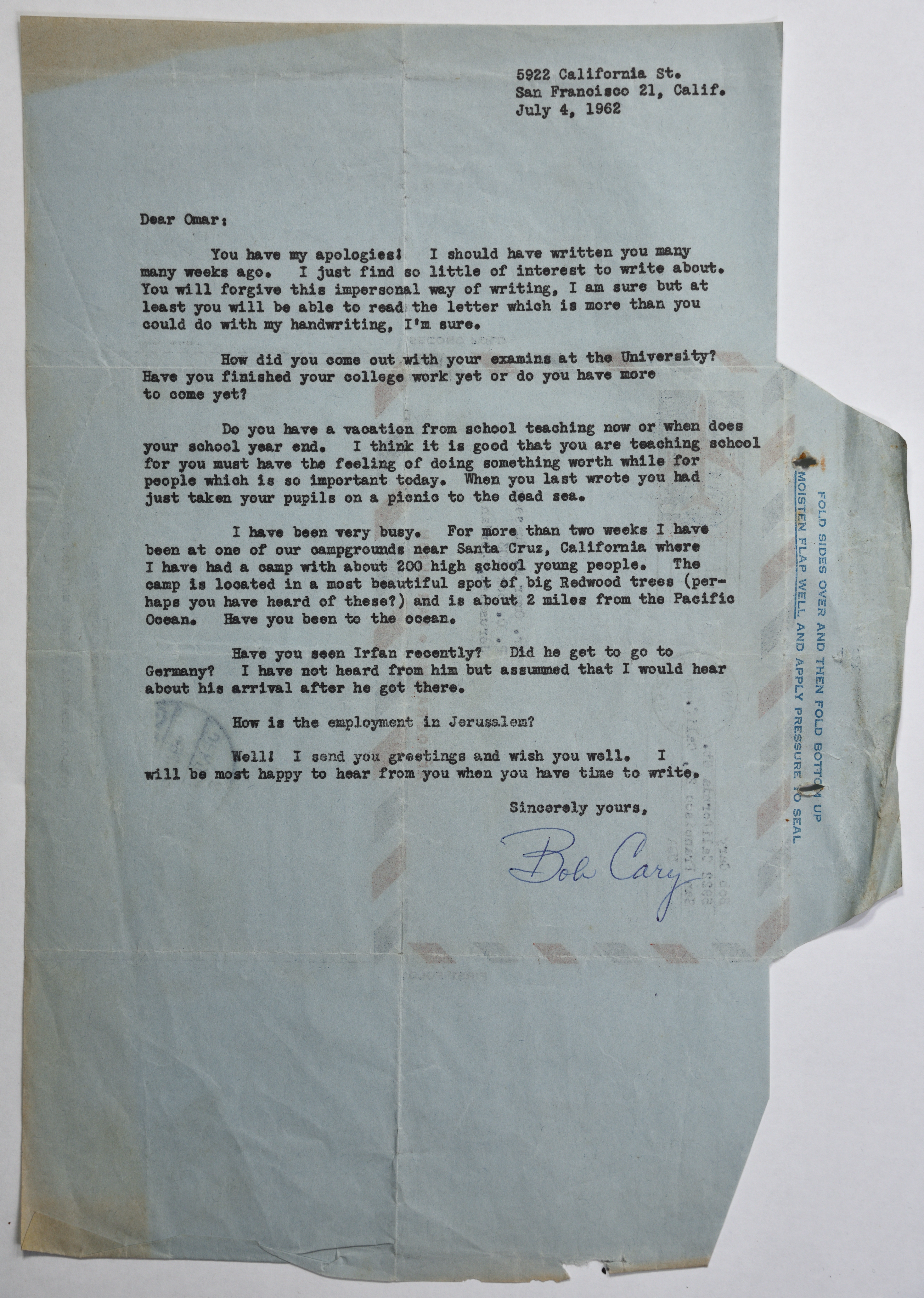 Sent on 4 July 1962, this document shows a letter from Bob Cary in San Fransisco to Omar al-Qasim in Jerusalem, apologizing for answering him late and asking about his studies, work in education, summer vacation and friend Irfan.