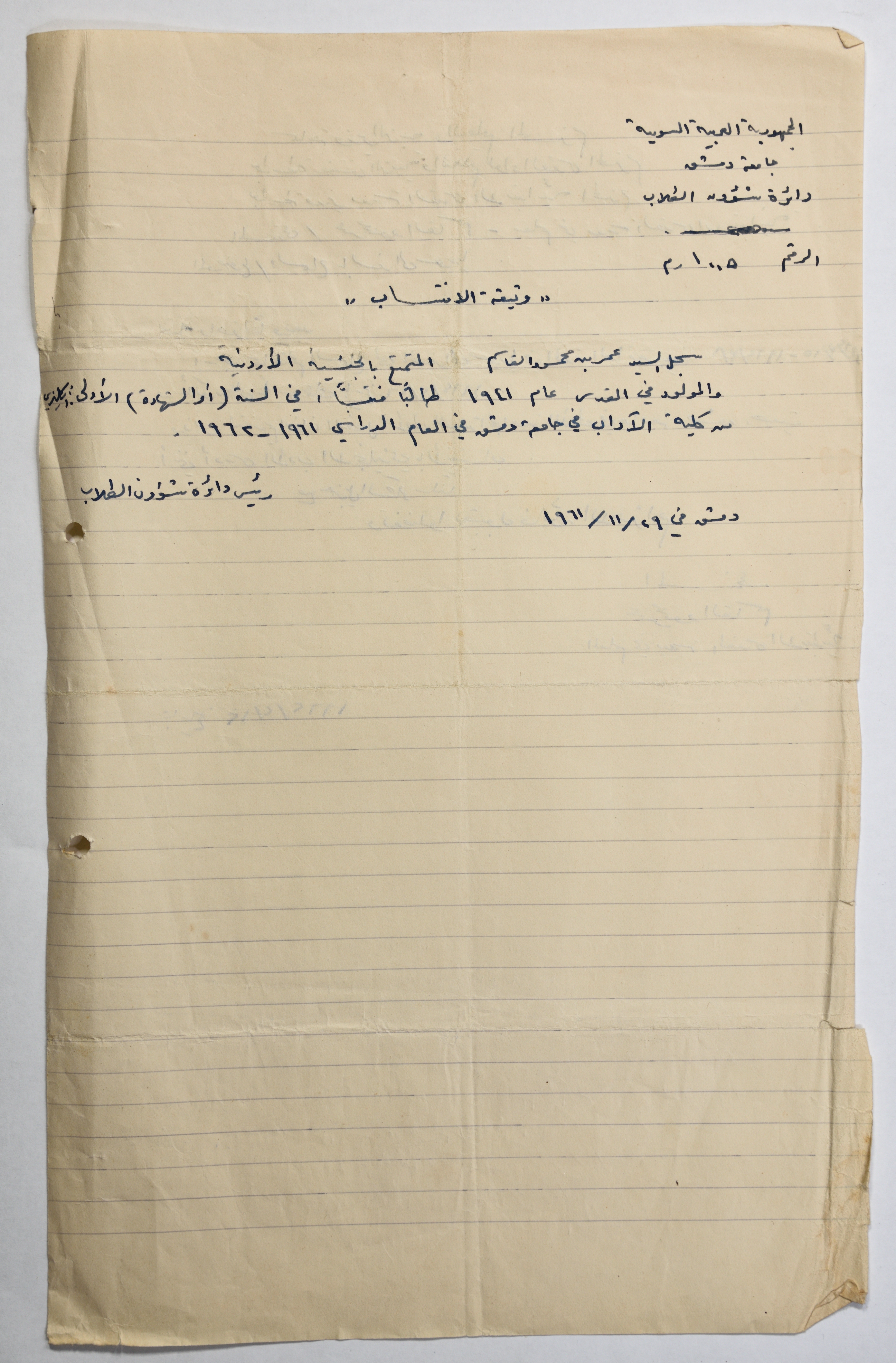 شهادة انتساب صادرة عن رئيس دائرة شؤون الطلاب، دمشق، 29 تشرين الثاني 1961