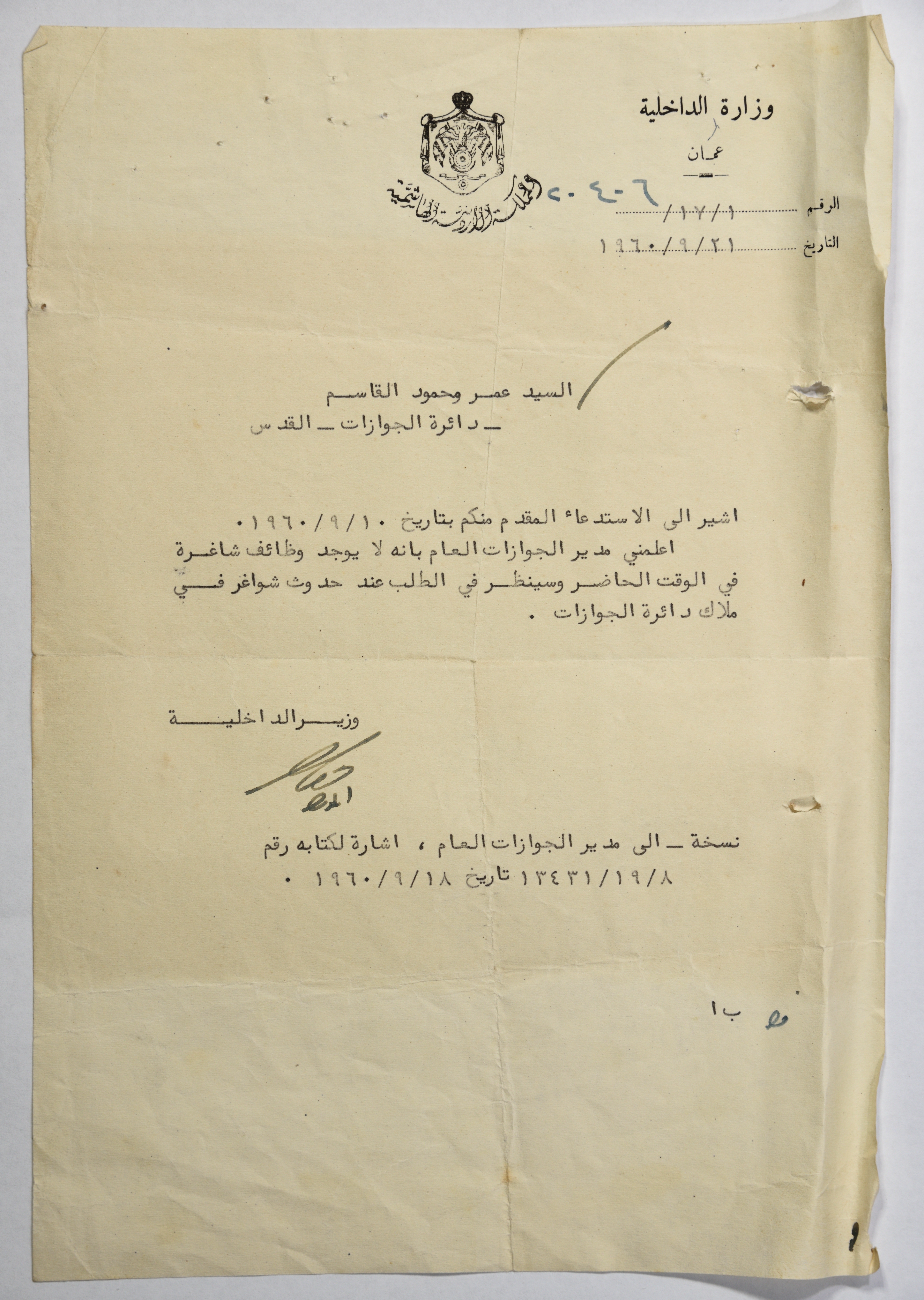 رسالة مؤرخة في 21 أيلول 19610، أرسلها وزير الداخلية الأردنية لعمر القاسم ردًا على تقديمه طلب عمل لدى دائرة الجوازات، تفيد بعدم وجود شواغر في الدائرة.