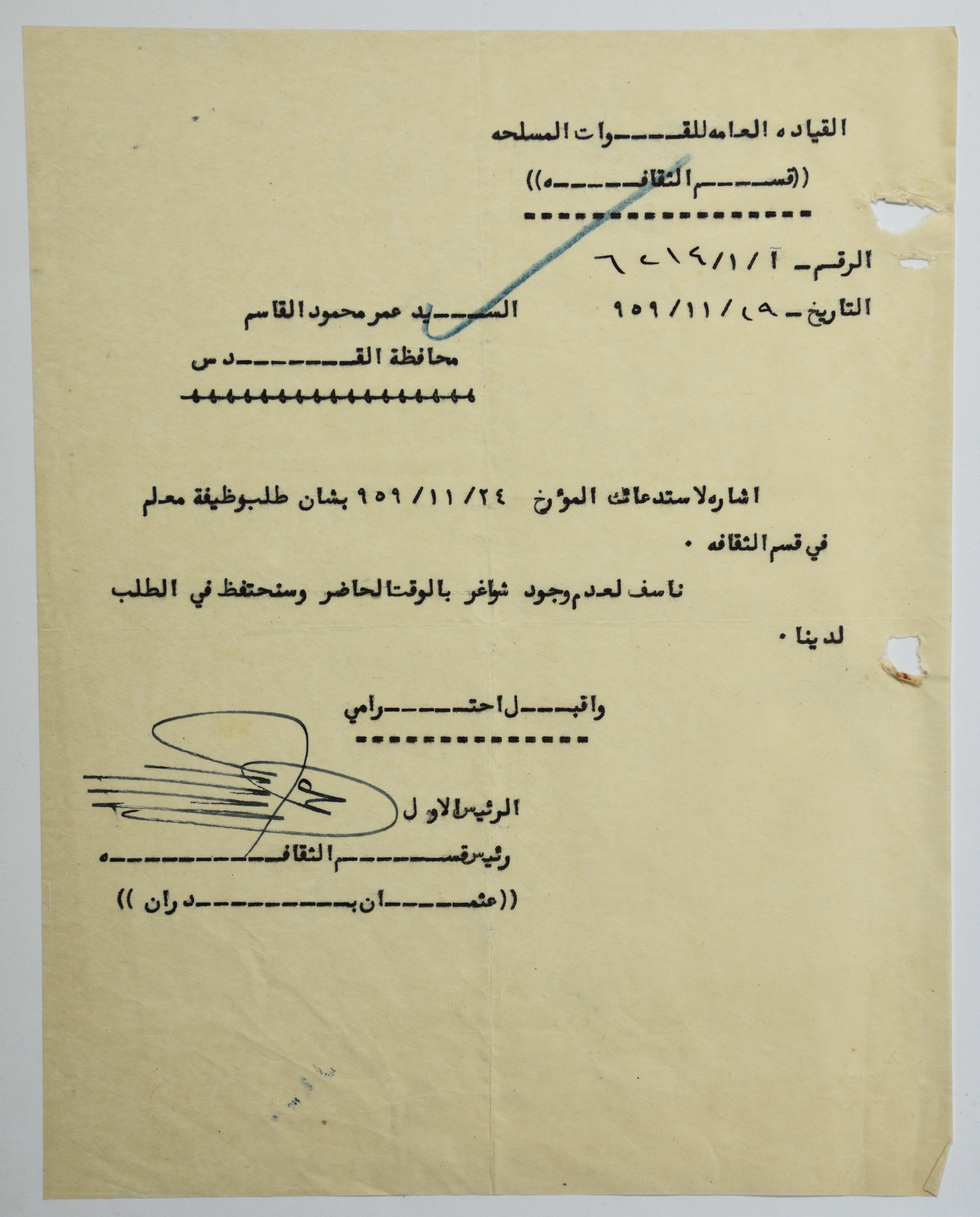 Sent on 29 November 1959, this document shows a letter from Othman Badran, Head of the Culture Department at the General Command of the Armed Forces in Jerusalem, to Omar al-Qasim, informing him that there are not any teaching vacancies.