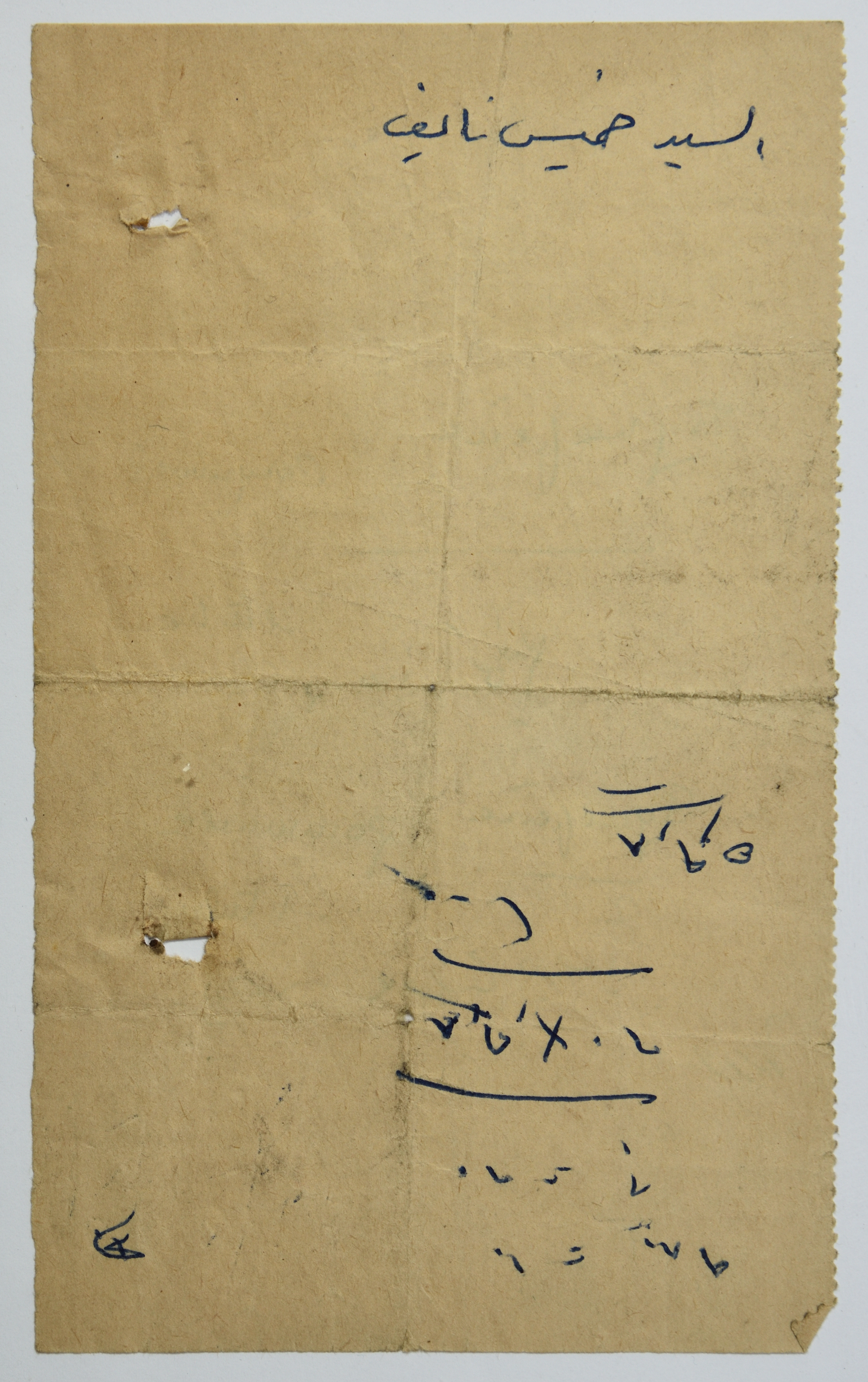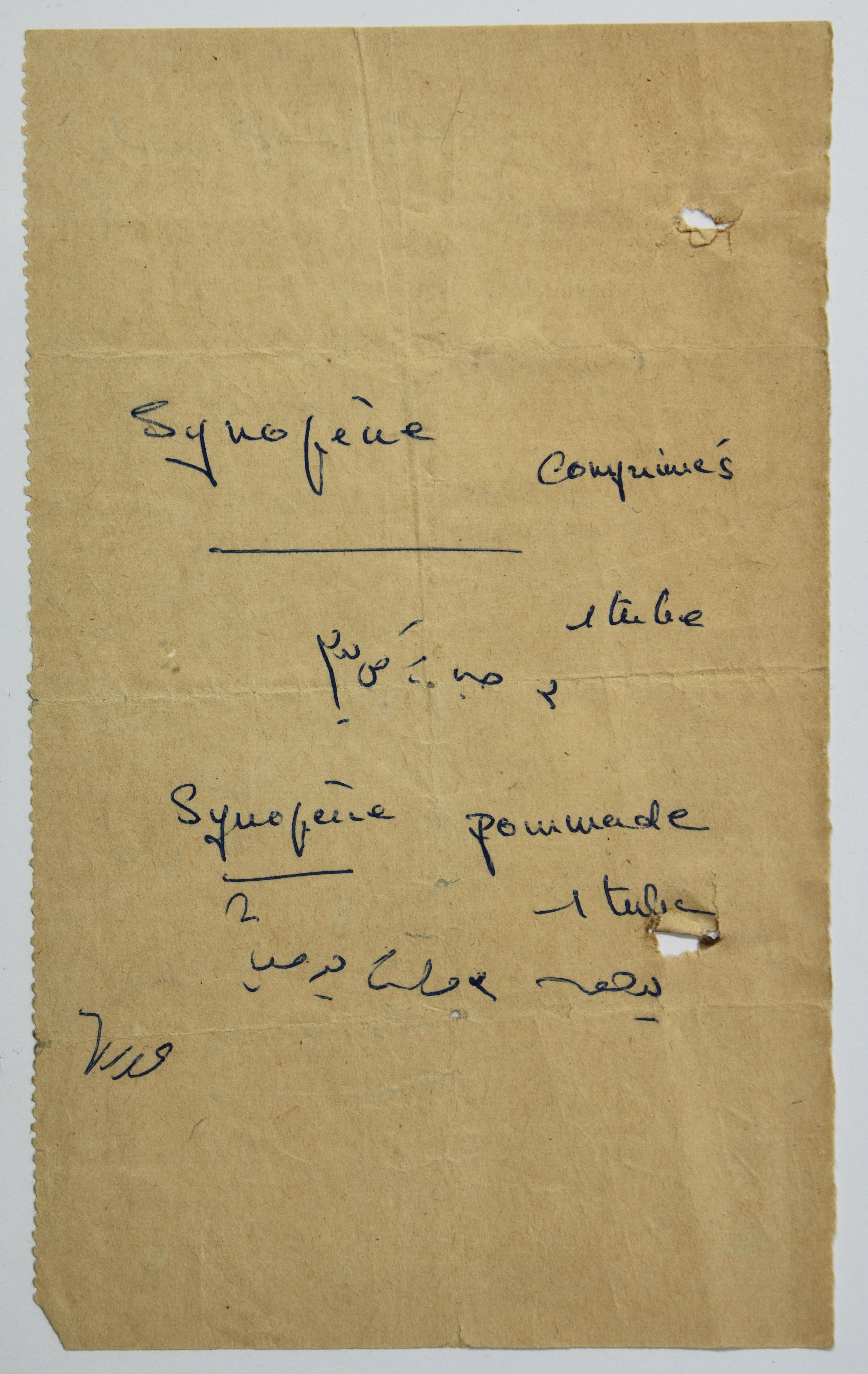 وصفة طبية تتضمن نوعين من الأدوية وتعود لخمسينيات القرن العشرين، دوِّن عليها من الخلف اسم نايف خميس.