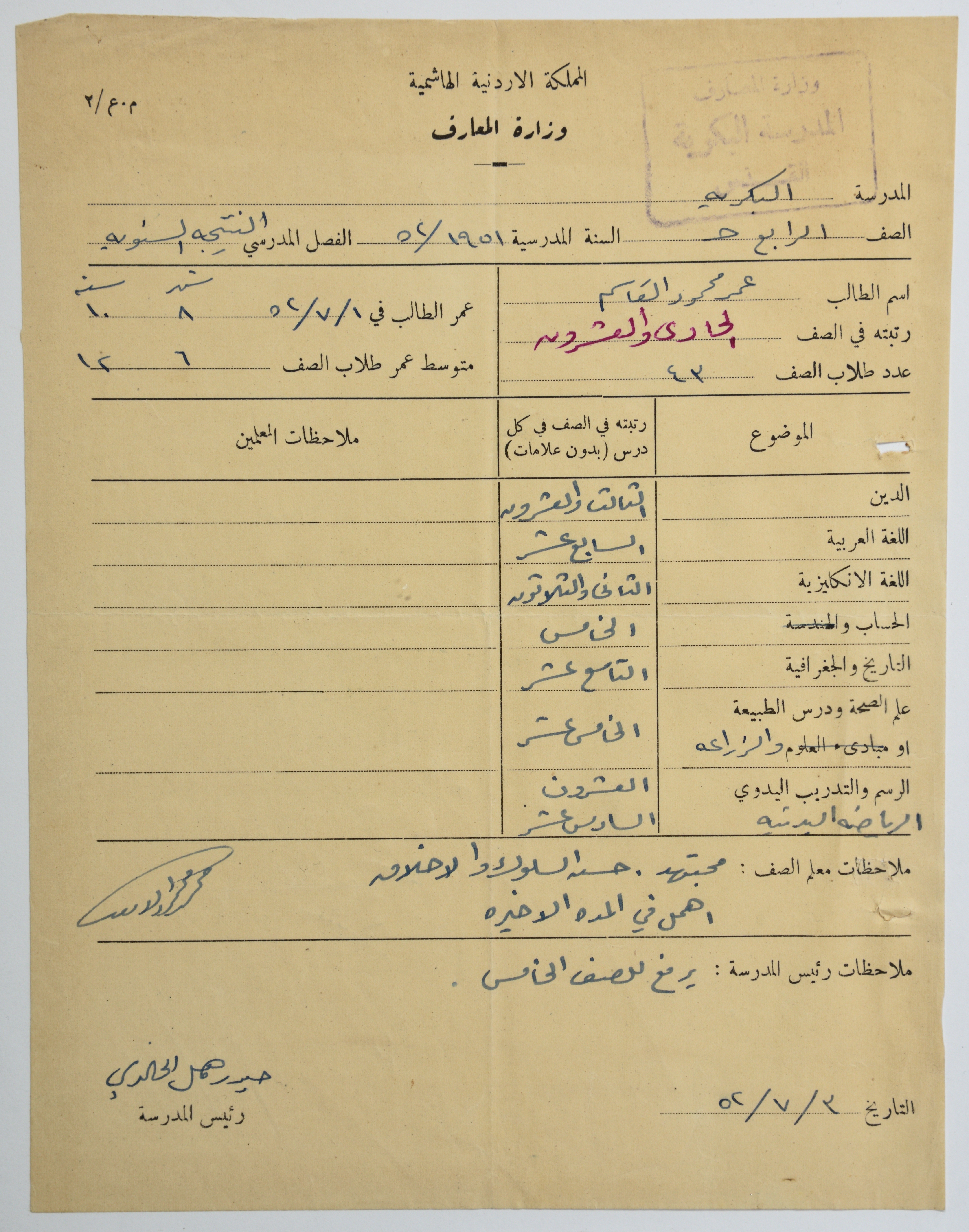 A Yearly School Report Card for Omar al-Qasim in the 4th Grade, Jerusalem, 3 July 1952
