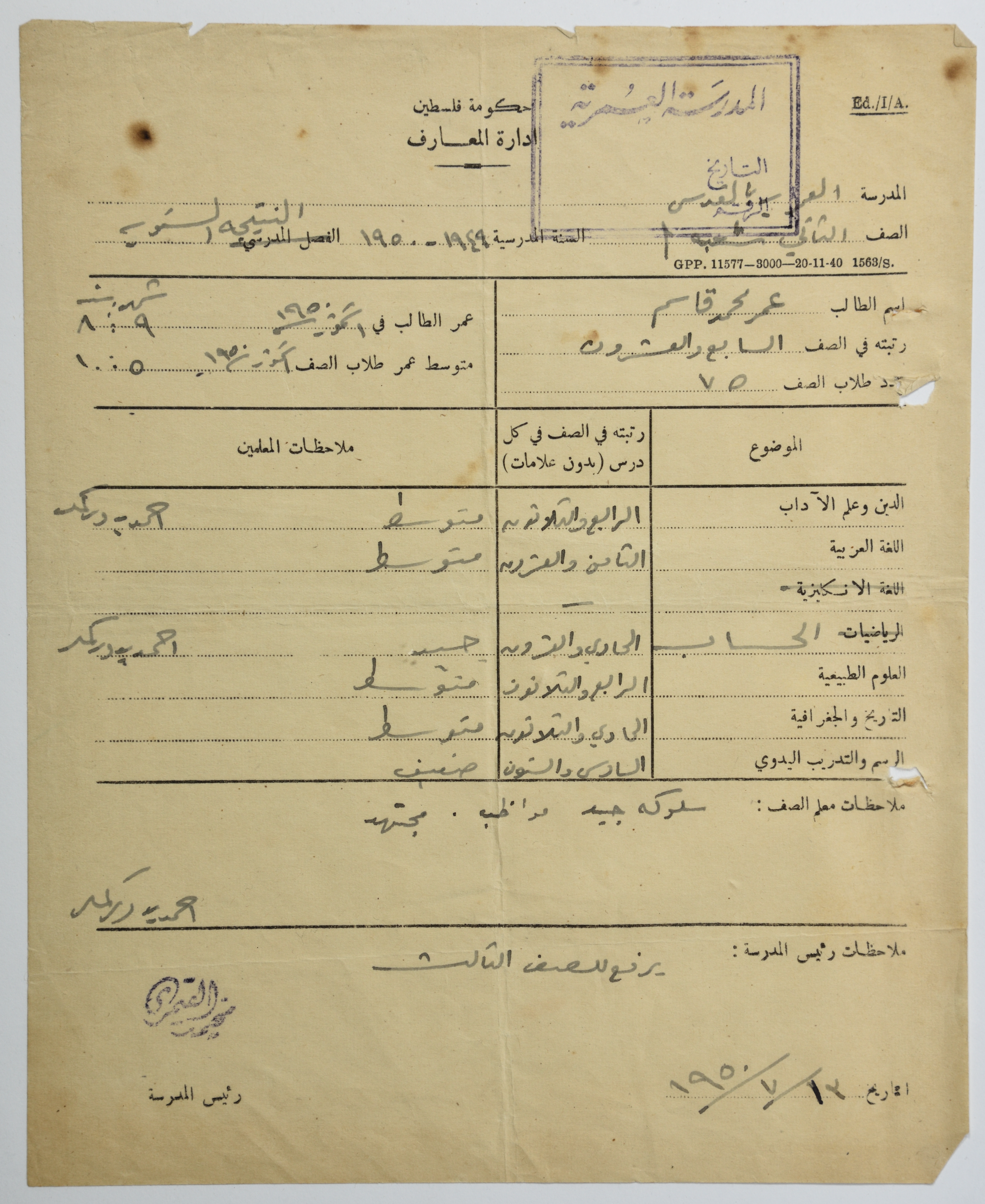 الشهادة المدرسية السنوية لعمر القاسم في الصف الثاني، صدرت عن المدرسة العمرية في القدس بتاريخ 13 تموز 1950، وعليها يظهر ختم المدرسة وتوقيع مديرها.