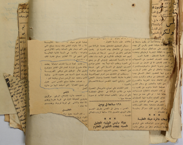 قصاصة من جريدة تتضمن خبرًا يتحدث عن الاجتماع الذي عقدته لجنة ضريبة المعارف، وبحثت خلاله مشروع الموازنة للعام المالي القادم، واتخذت قرارًا بتعيين عمر القاسم بوظيفة كاتب، وذلك في ستينيات القرن العشرين.