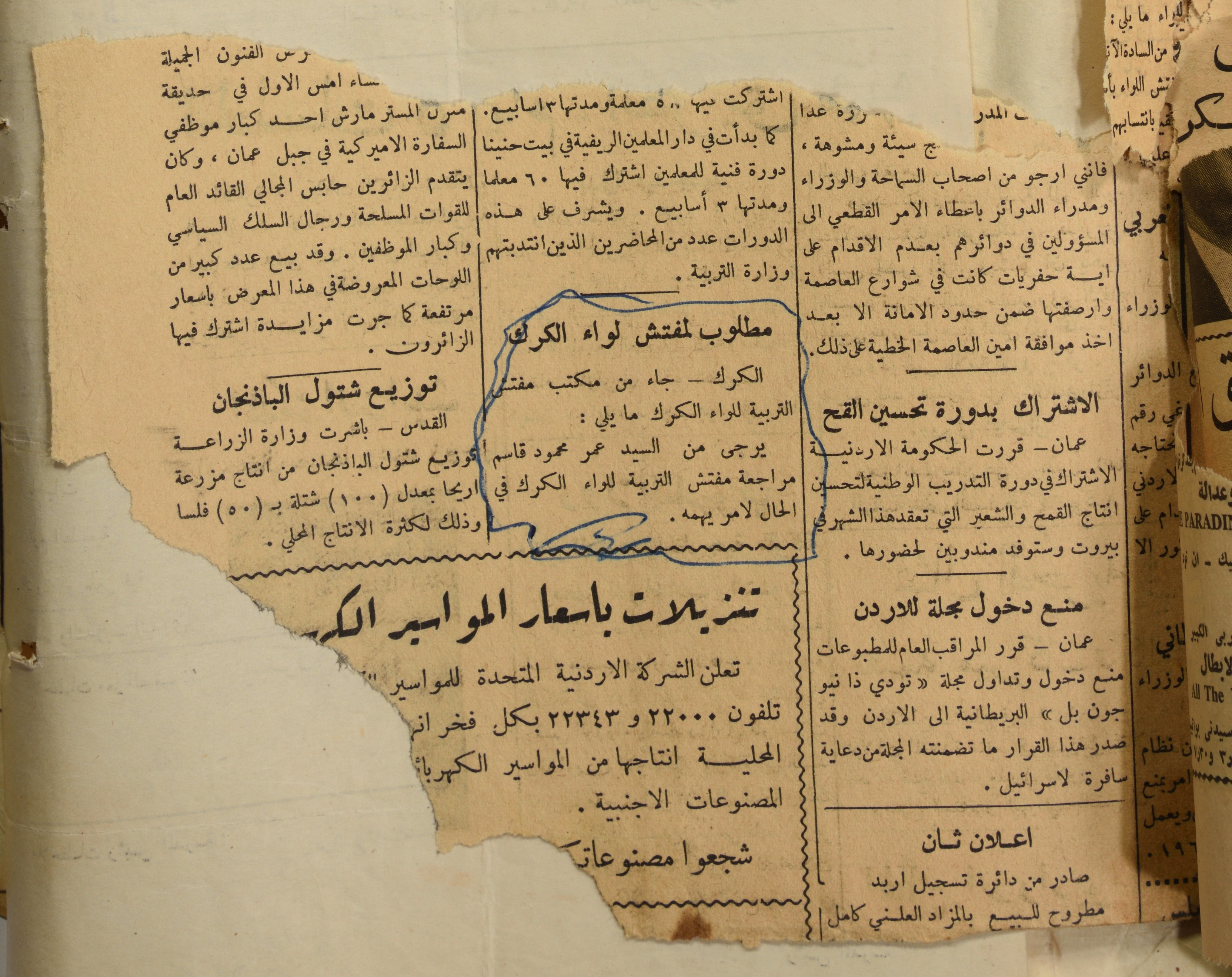 "مطلوب لمفتش لواء الكرك"، قصاصة من جريدة، ستينيات القرن العشرين