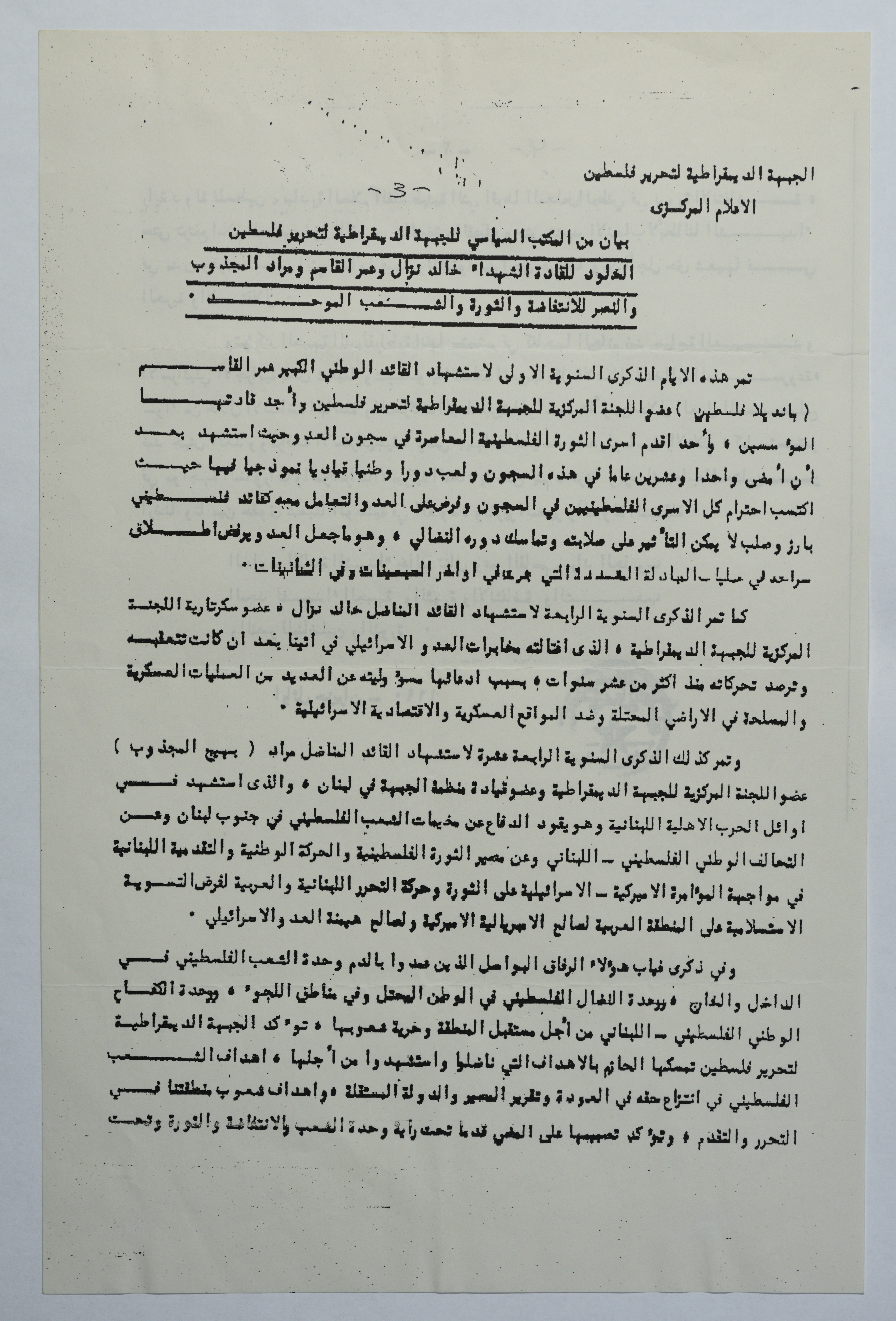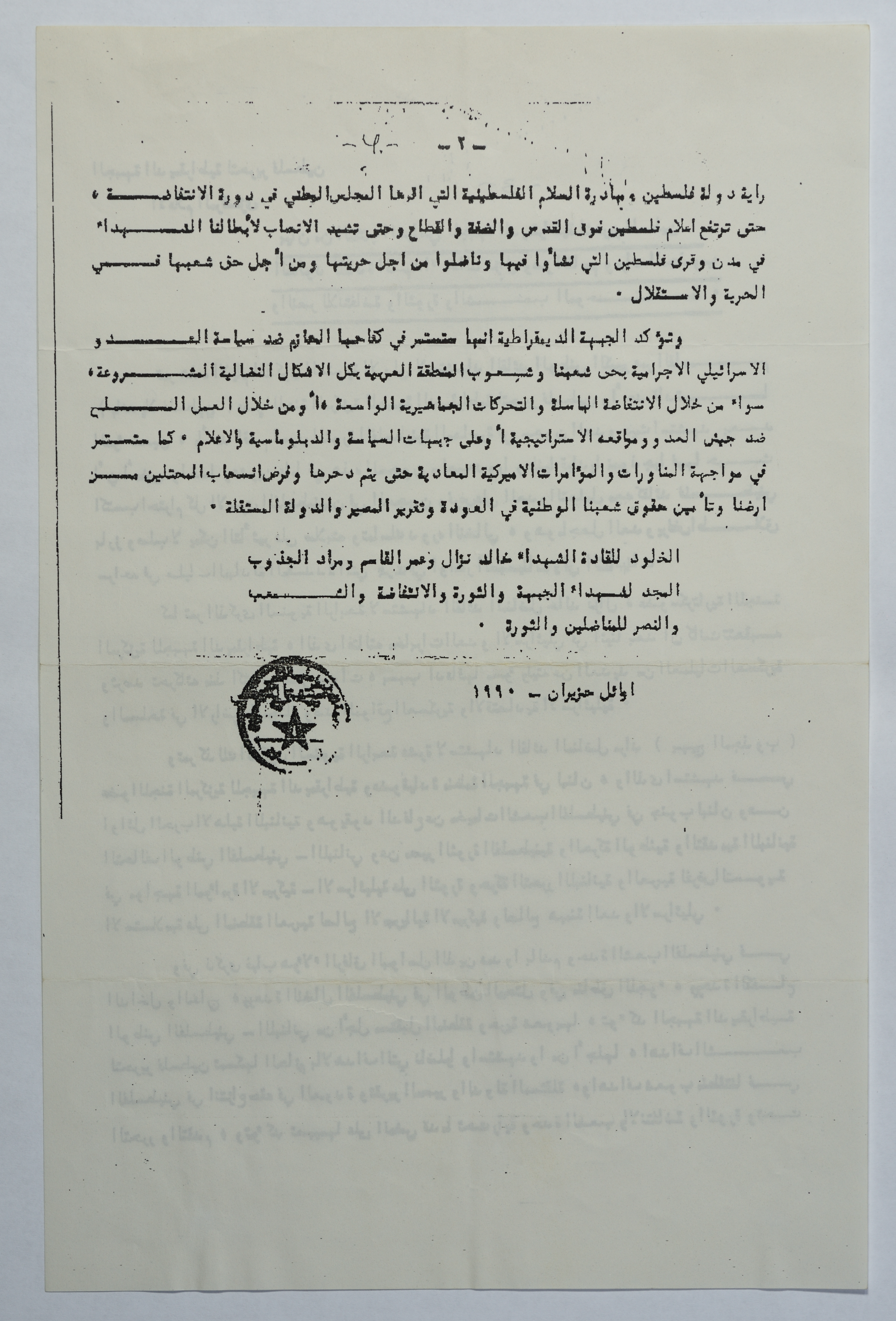 بيان الجبهة الديمقراطية في الذكرى الأولى لاستشهاد عمر القاسم، حزيران 1990