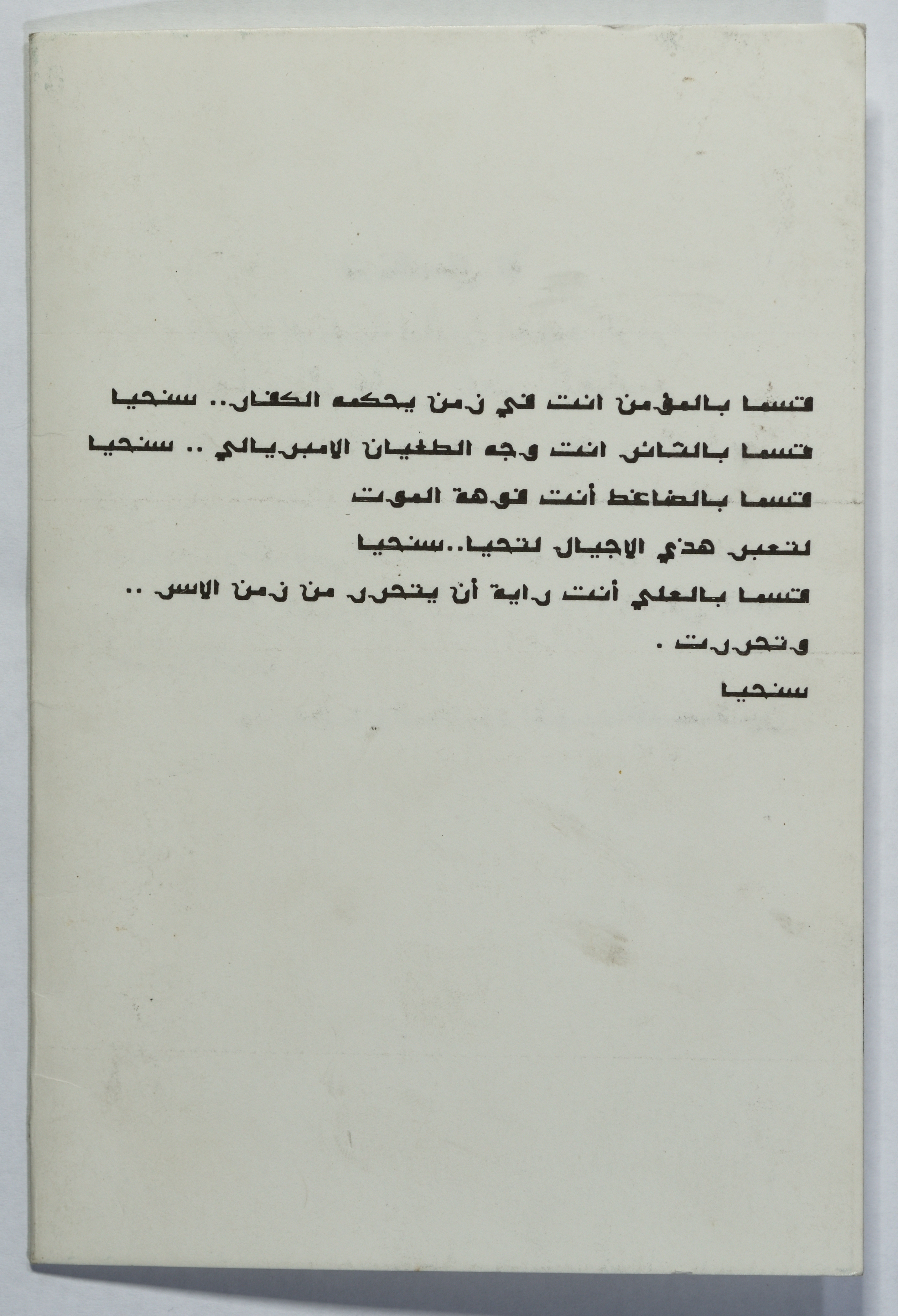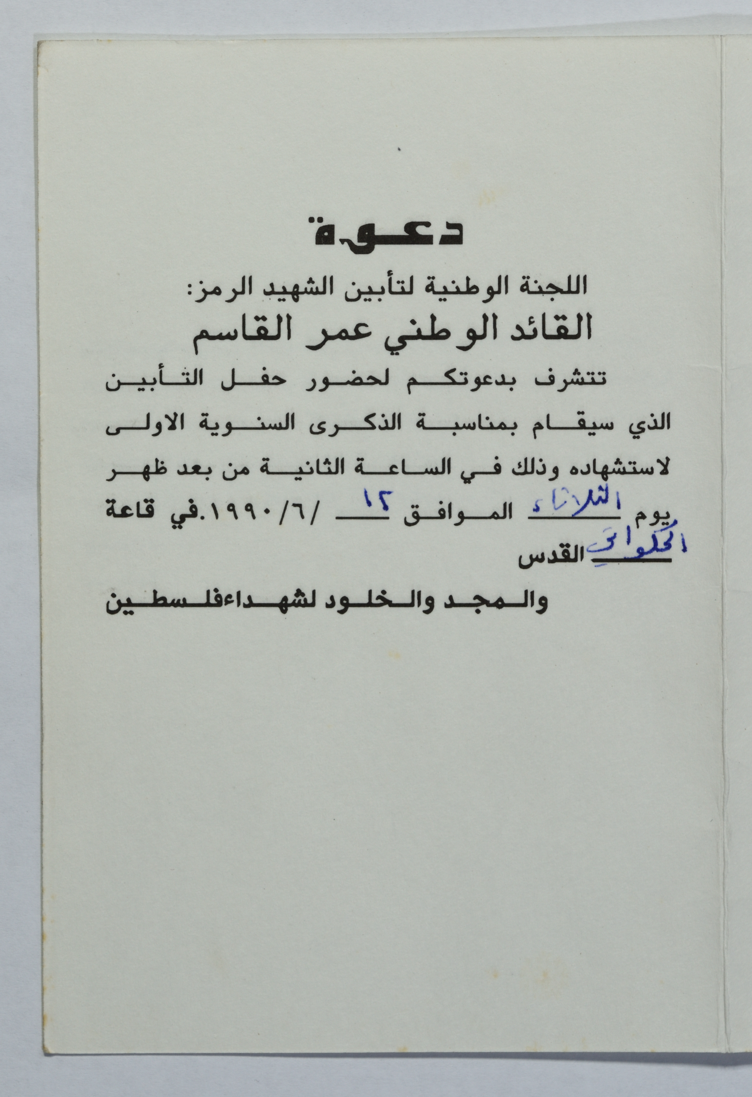 Dated 12 June 1990, this document shows an invitation to the memorial service for shaheed Omar al-Qasim's first-year commemoration of his murder held on the al-Hakawati stage in Jerusalem.