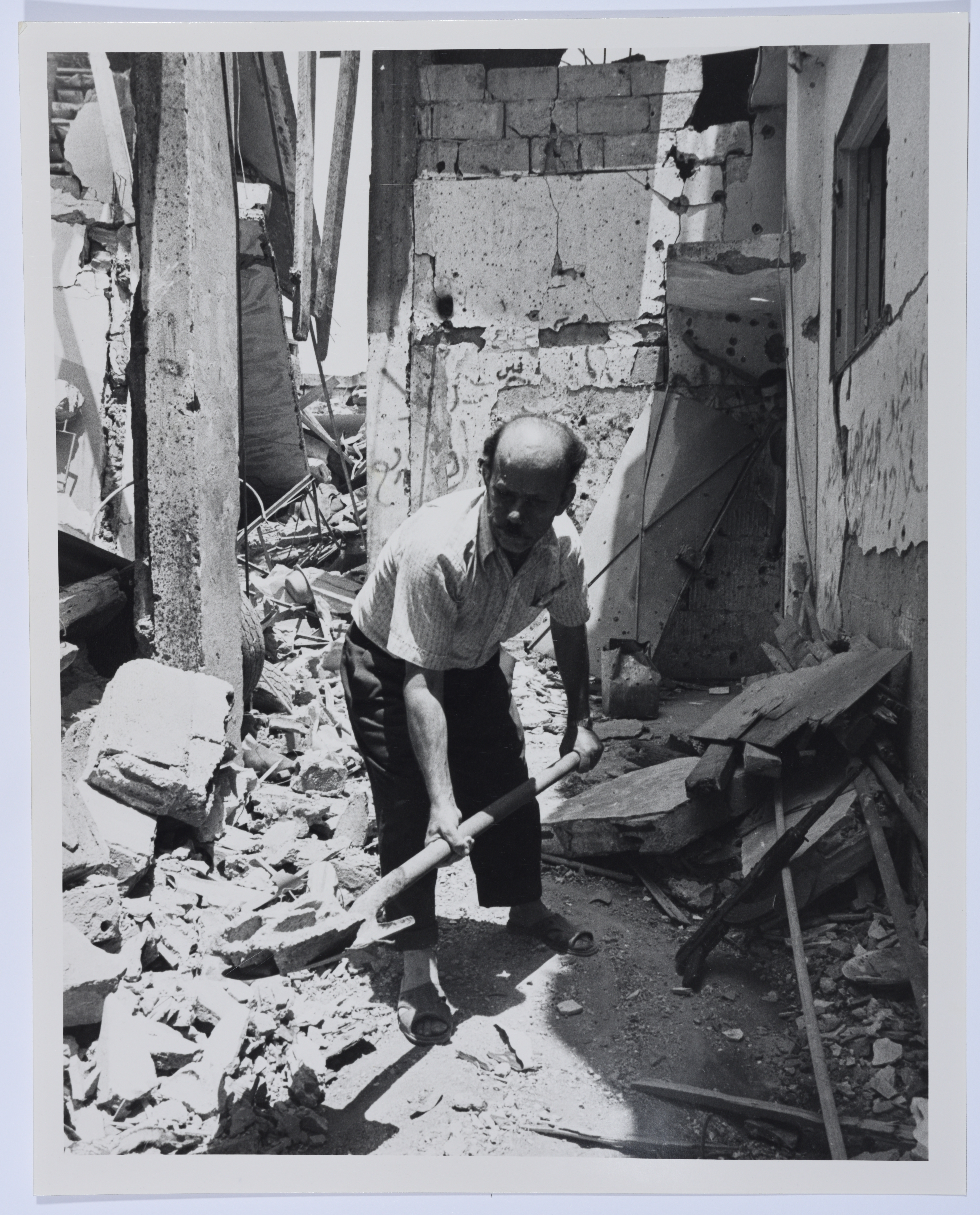 صورة لرجل أثناء قيامه بإزالة ركام أحد المنازل المدمرة في أحد مخيمات اللاجئين الفلسطينيين في لبنان. والتُقطت الصورة في تشرين الثاني 1986.