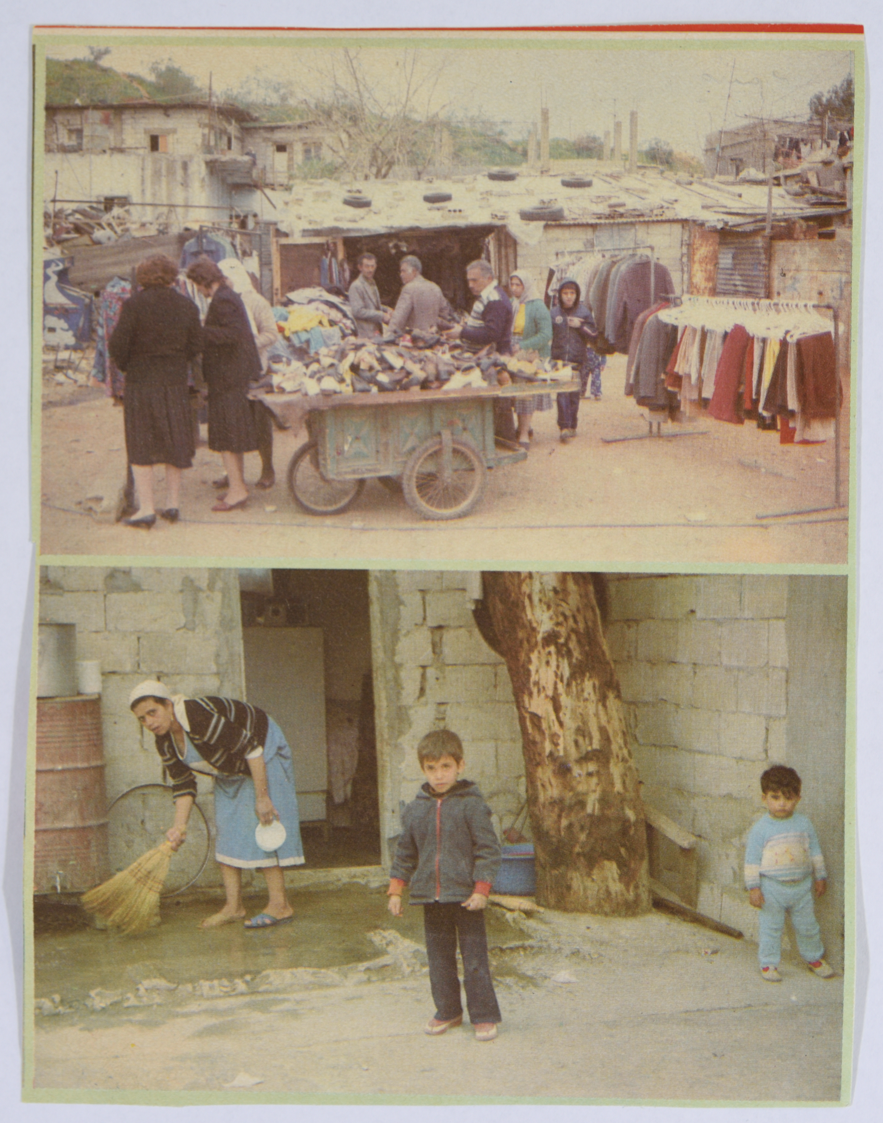 قصاصة ملونة من مجلة غير معروفة تحوي صورتان تظهر فيهما مجموعة من اللاجئين الفلسطينيين يتسوقون (أعلى) وسيدة تقوم بتنظيف ساحة منزلها وحولها أطفالها في مخيم صبرا (أسفل) في مخيم صبرا للاجئين.
