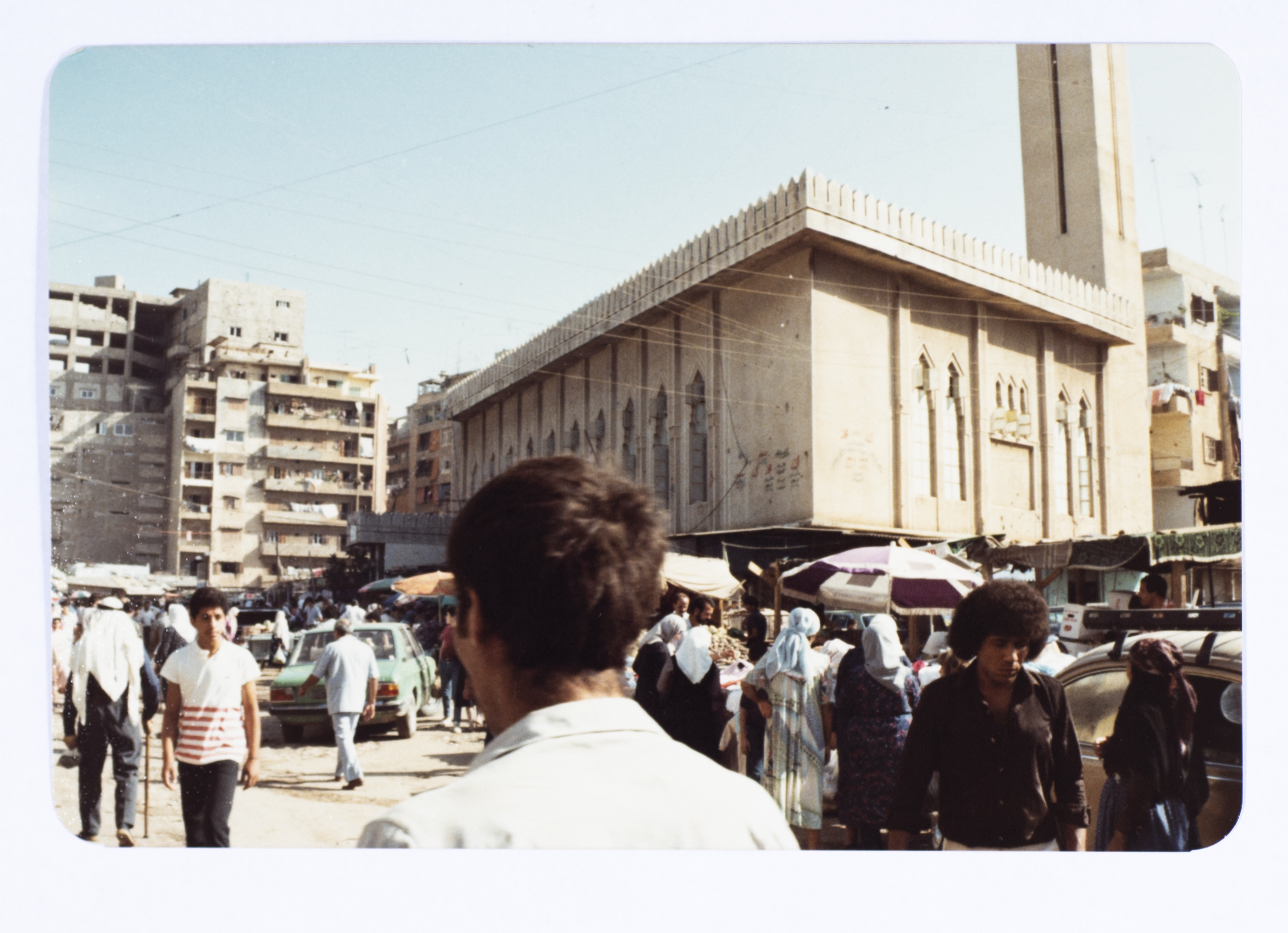 صورة ملونة لسوق الخضار في مخيم صبرا للاجئين ويظهر جامع الدنا الى اليمين .