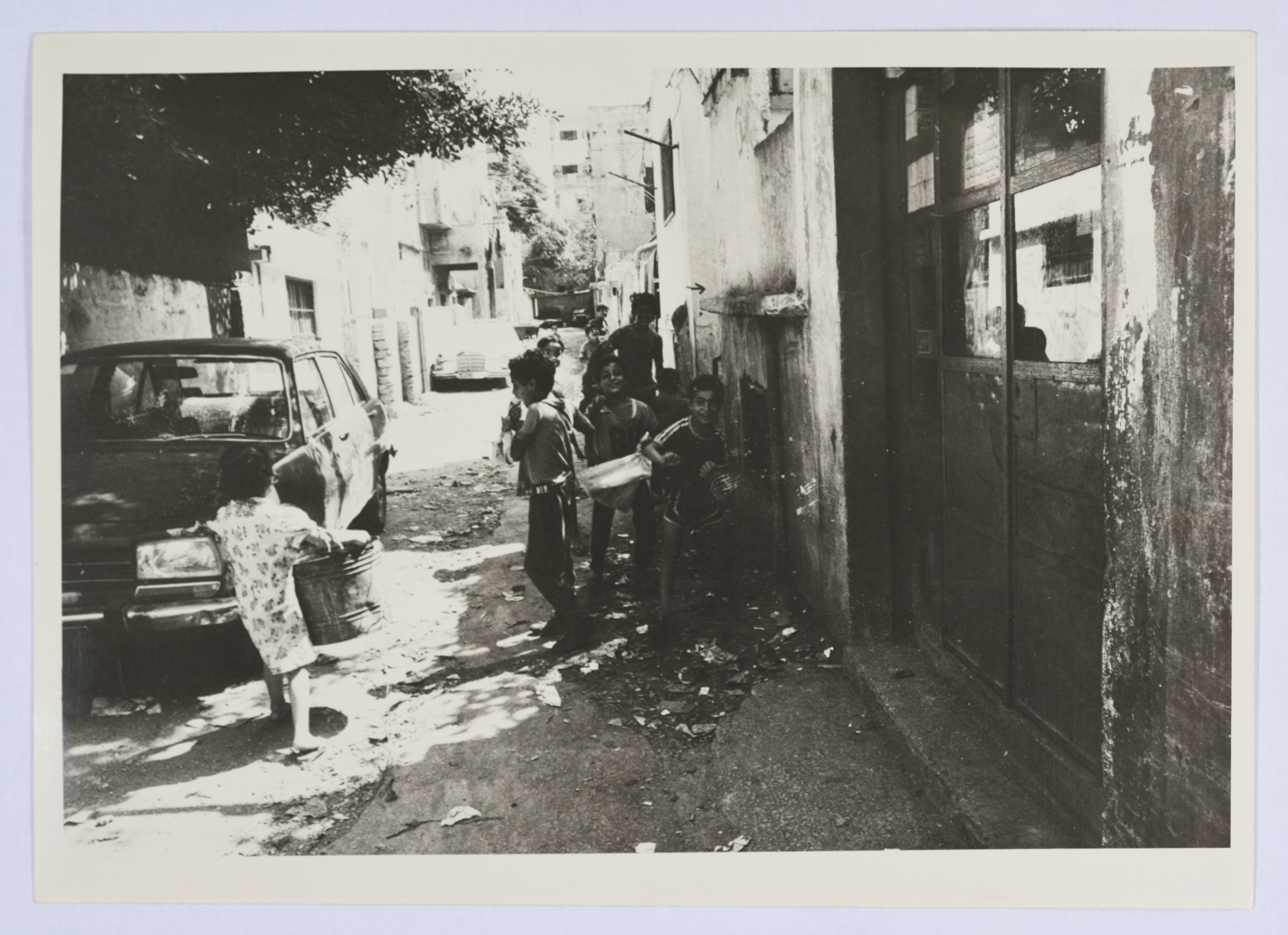 صورة غير ملونة لمجموعة من الأطفال في أحد ازقة مخيم شاتيلا للاجئين في لبنان. وتبيِّن الصورة الظروف المعيشية السيئة التي عاشها الفلسطينيون في مخيمات اللاجئين في لبنان.