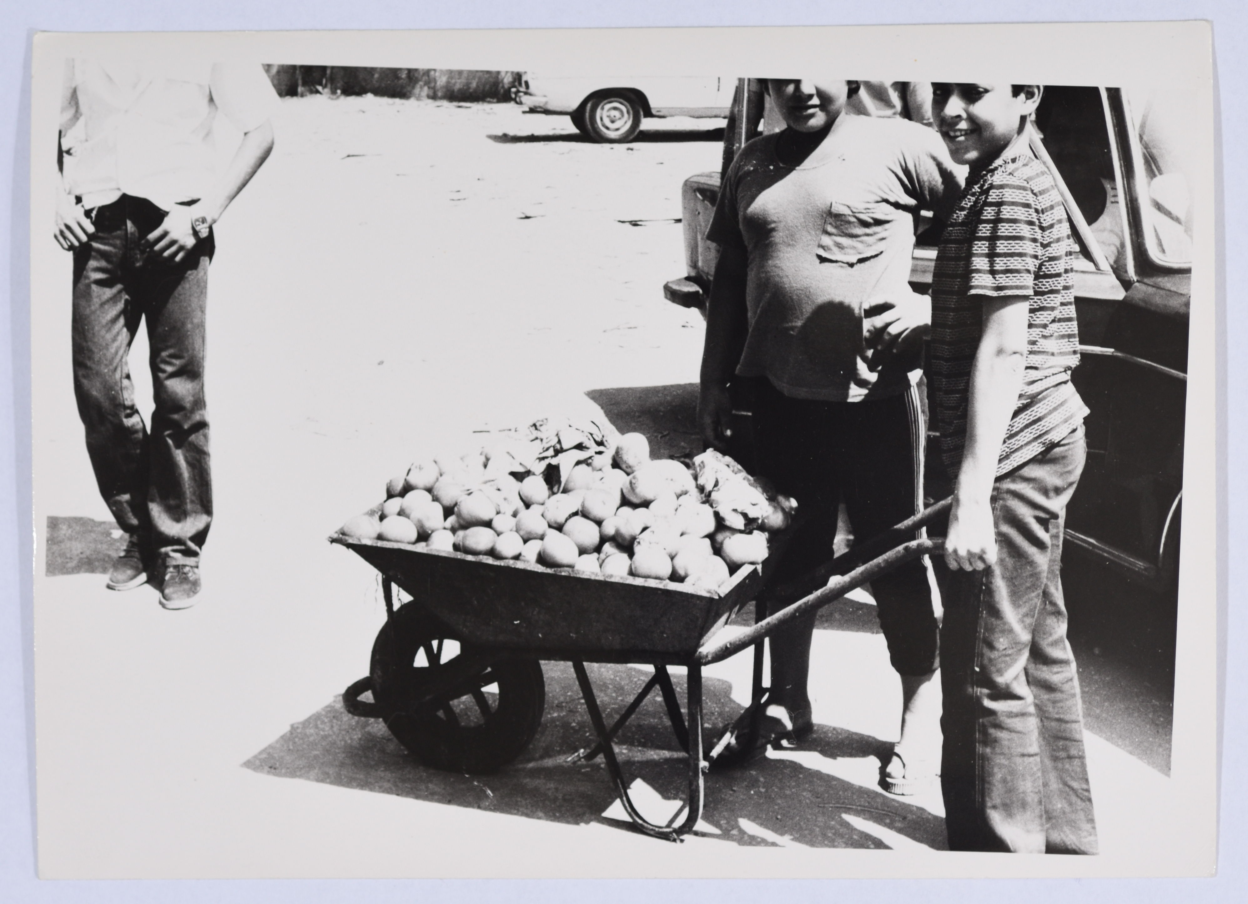 صورة غير ملونة لفتى يجر عربة مُحمَّلة بالفاكهة في مخيم شاتيلا للاجئين.