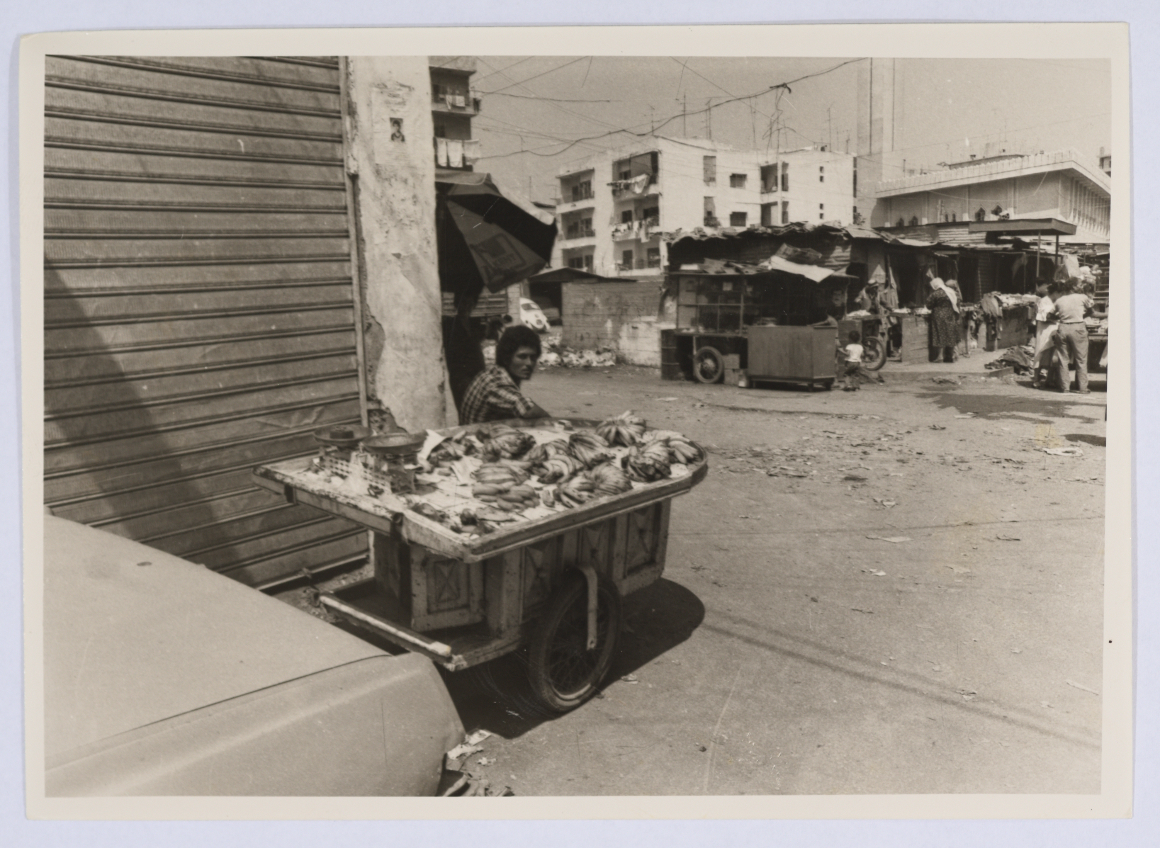صورة غير ملونة لبائع يجلس بالقرب من عربته في سوق الخضار بالقرب من صبرا وشاتيلا.