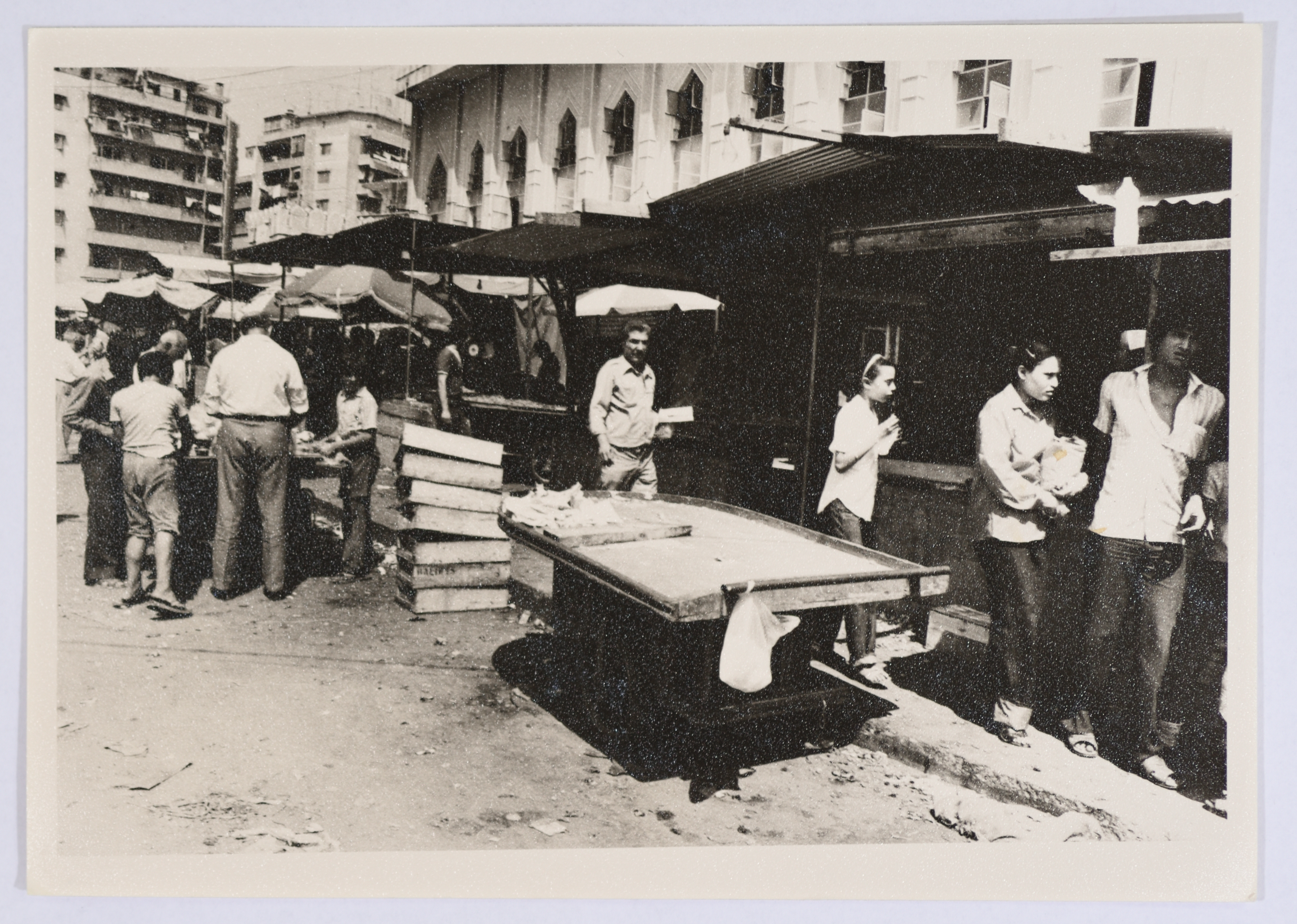 صورة غيرملونة لمجموعة من الأشخاص في الأسواق القريبة من مخيم شاتيلا للاجئين وحي صبرا في لبنان. يظهر في الصورة البسطات المستخدمة لعرض البضاعة يعلوها أسقف من الزينكو.