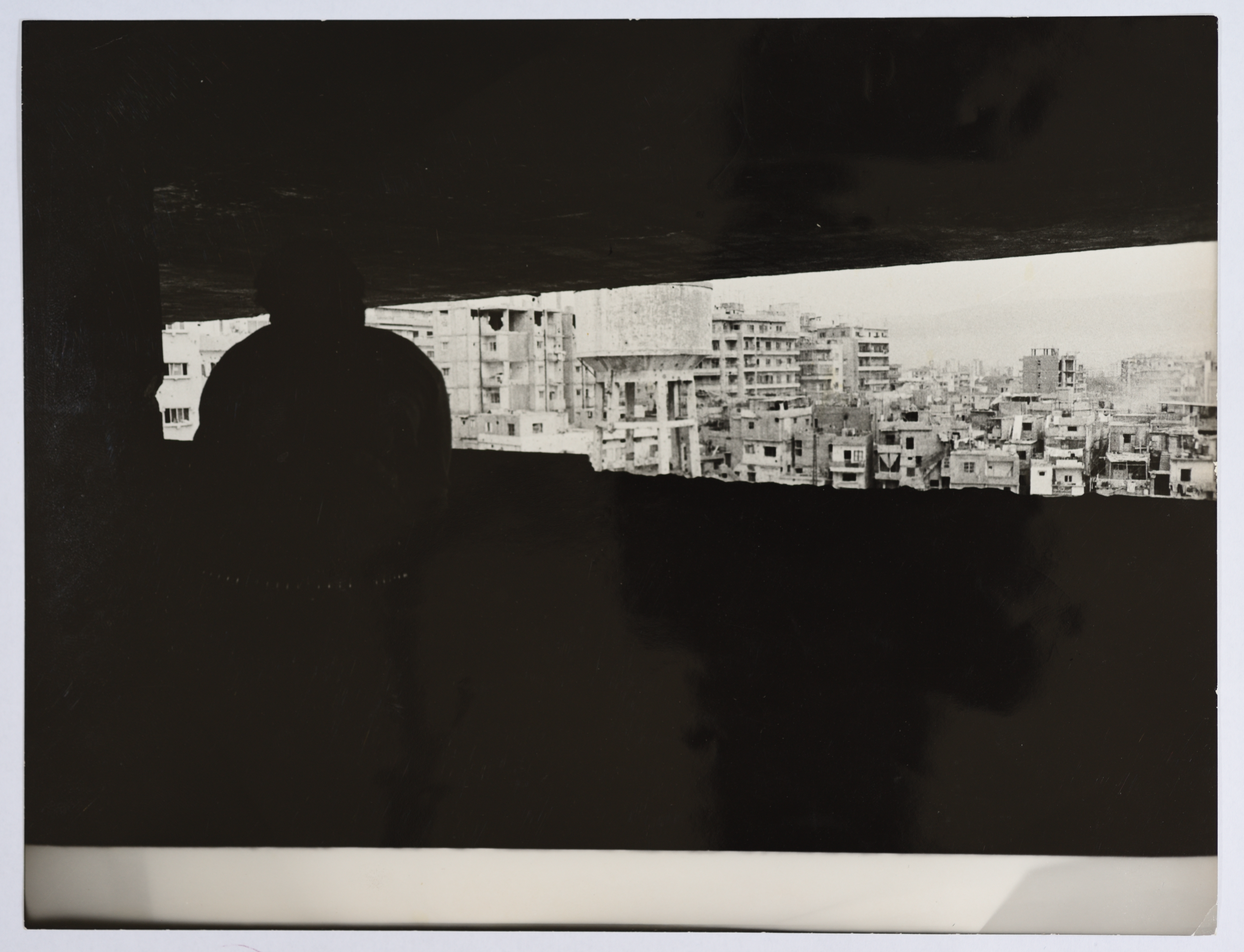 صورة غير ملونة لِمُقاتِل من حركة أمل أثناء تمترسه في مكان مُرتِفع يُشرف منه على مخيم شاتيلا للاجئين في لبنان. التُقطت الصورة خلال حرب المخيمات وهي صراع فرعي من الحرب الأهلية اللبنانية.
