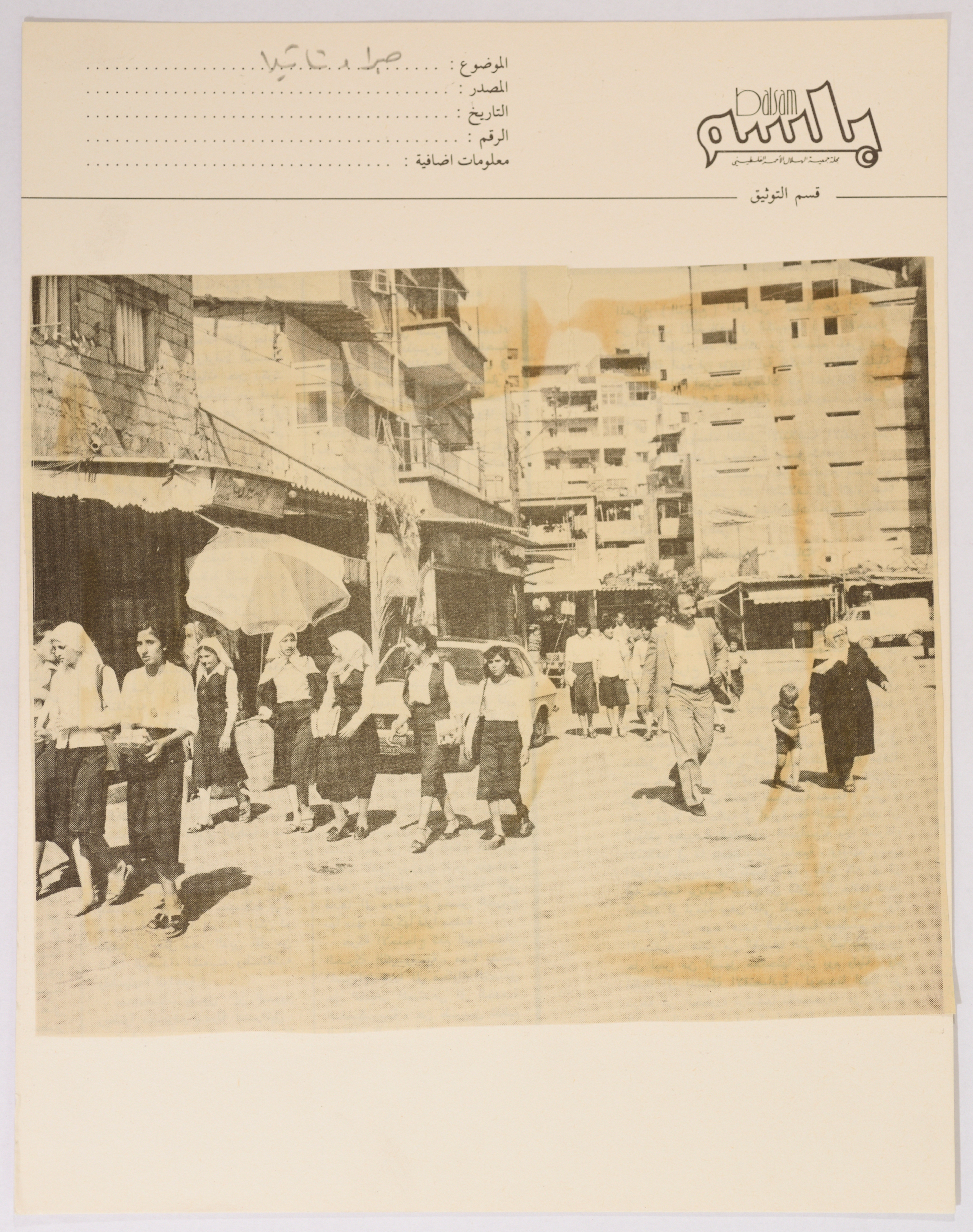 A black-and-white photograph of people in the streets of Sabra and Shatila Refugee Camp. The photograph was glued to a card; framed with the logo of Balsam Magazine, which is how the Palestine Red Crescent Society used to archive documents.