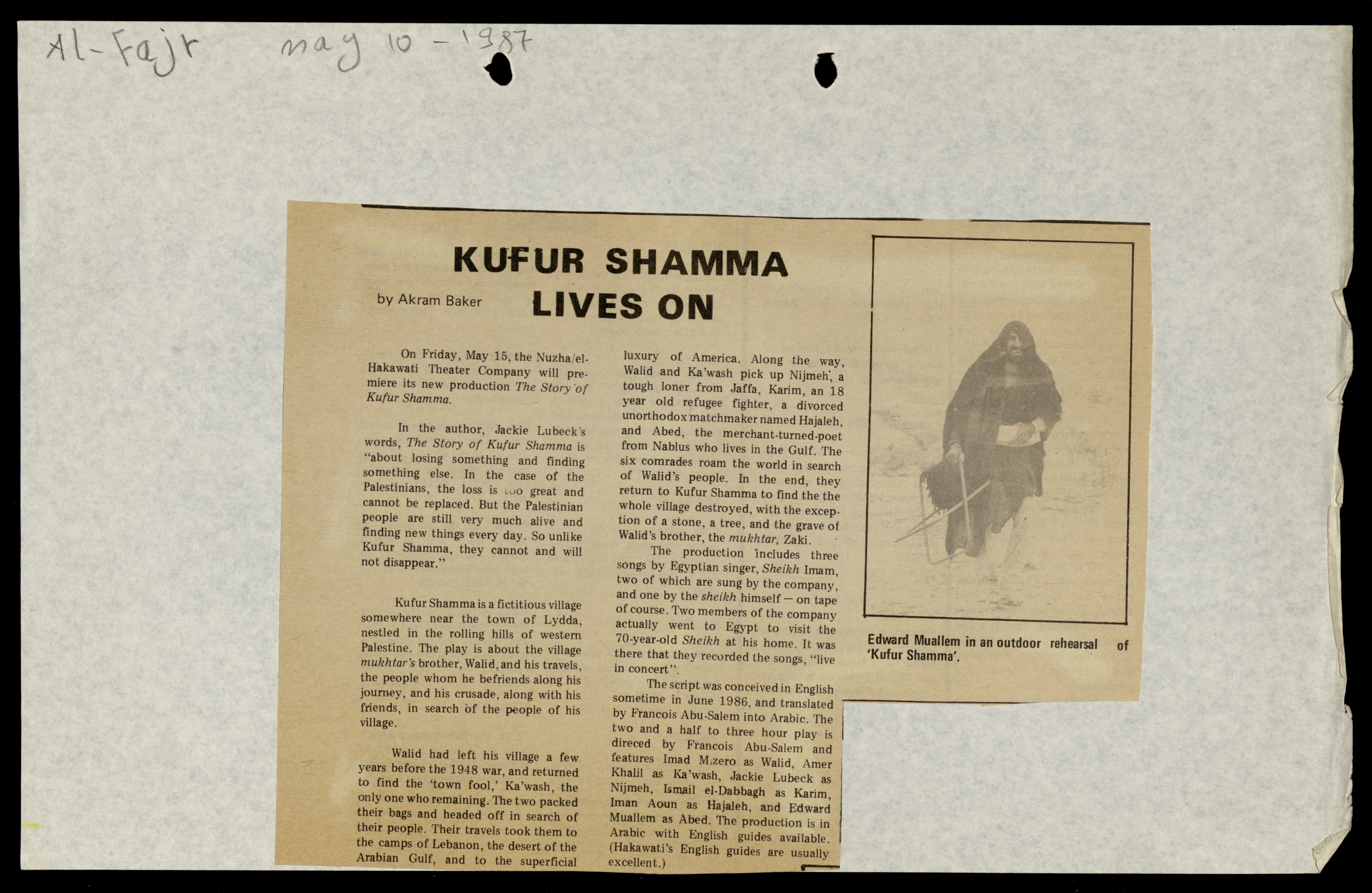 قصاصة من صحيفة الفجر تتضمن مقالاً عن مسرحية "كفر شما" لمسرح الحكواتي.