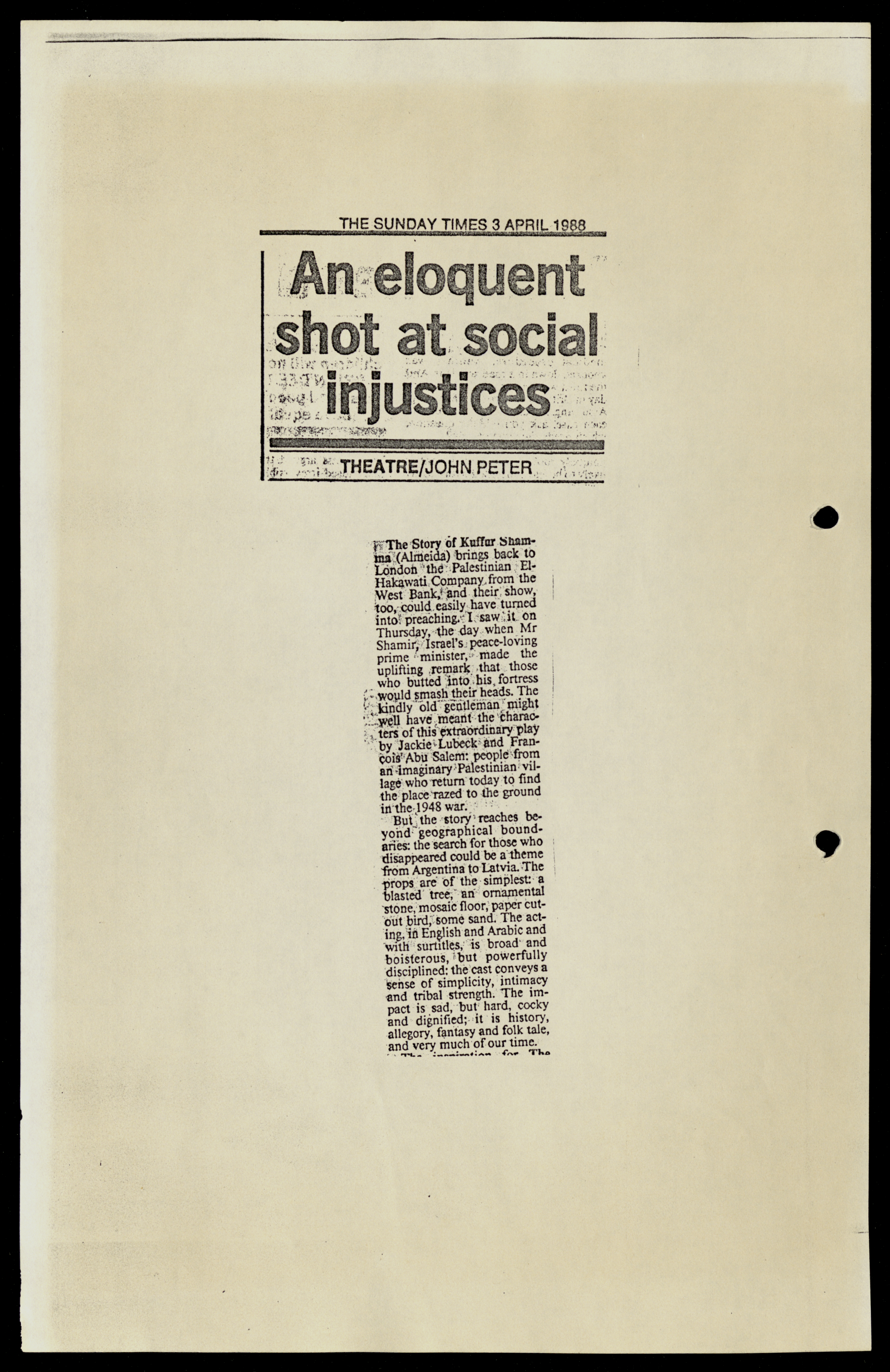 A newspaper clipping from the Sunday Times of an article on El-Hakawati Theatre's play "Kufur Shamma" by John Peter.