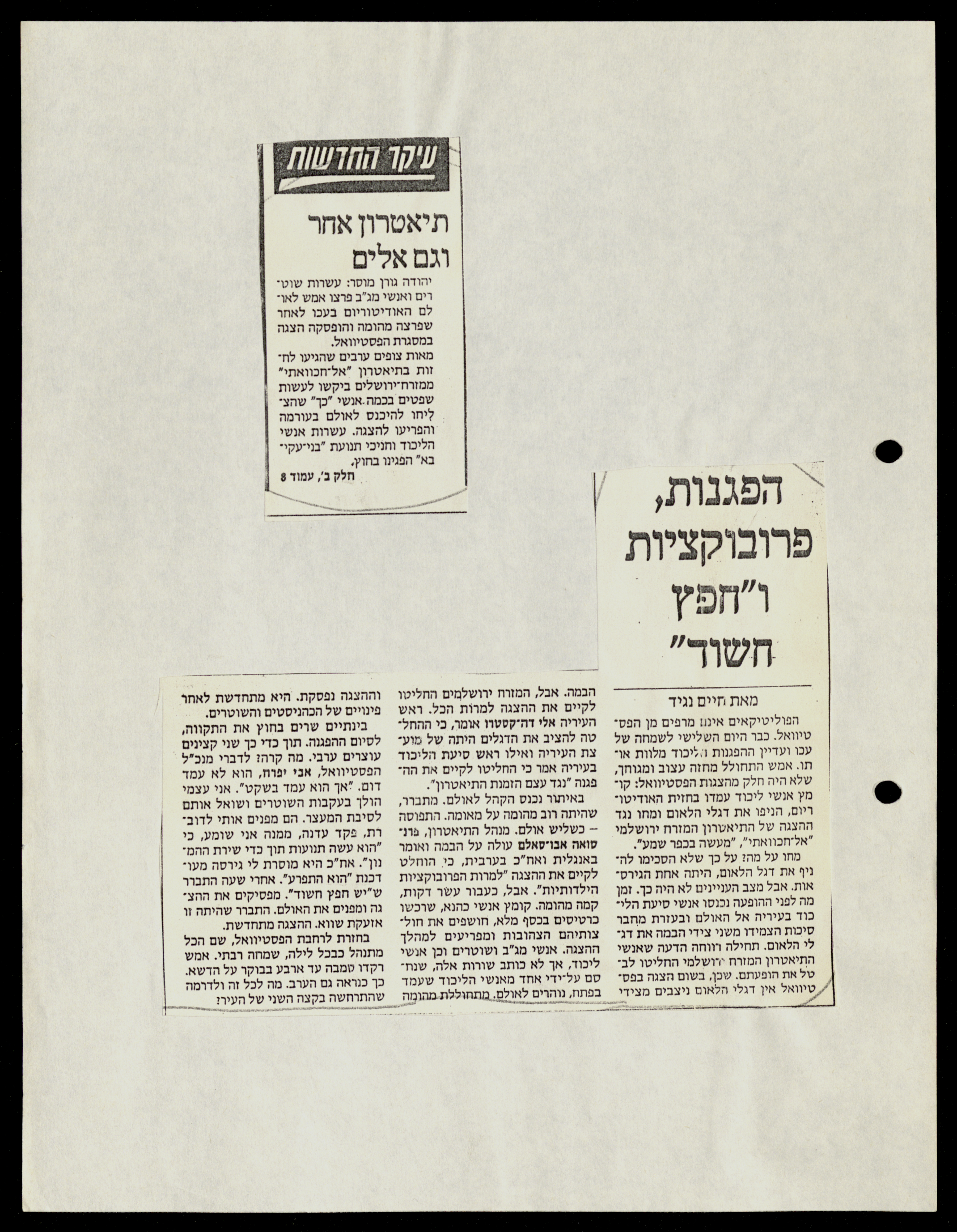 قصاصتان من جريدة بالعبرية، تحتويان على تقرير صحفي يتحدث عن مسرح الحكواتي.