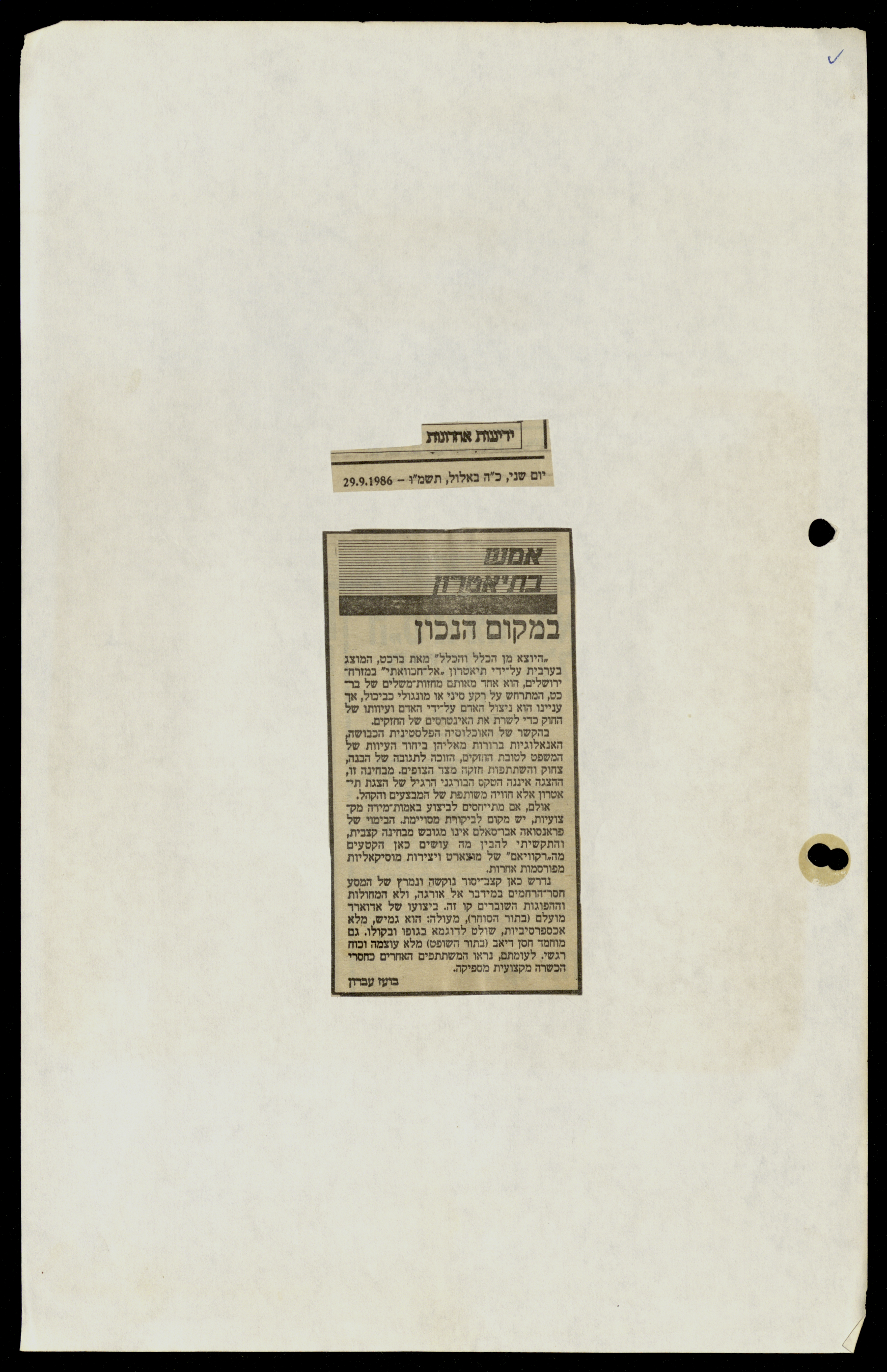 قصاصة من جريدة "يديعوت أحرنوت" العبرية، تحتوي على تقرير صحفي بعنوان "في المكان الصحيح"، يتحدث عن عرض "القاعدة والاستثناء" لمسرح الحكواتي.