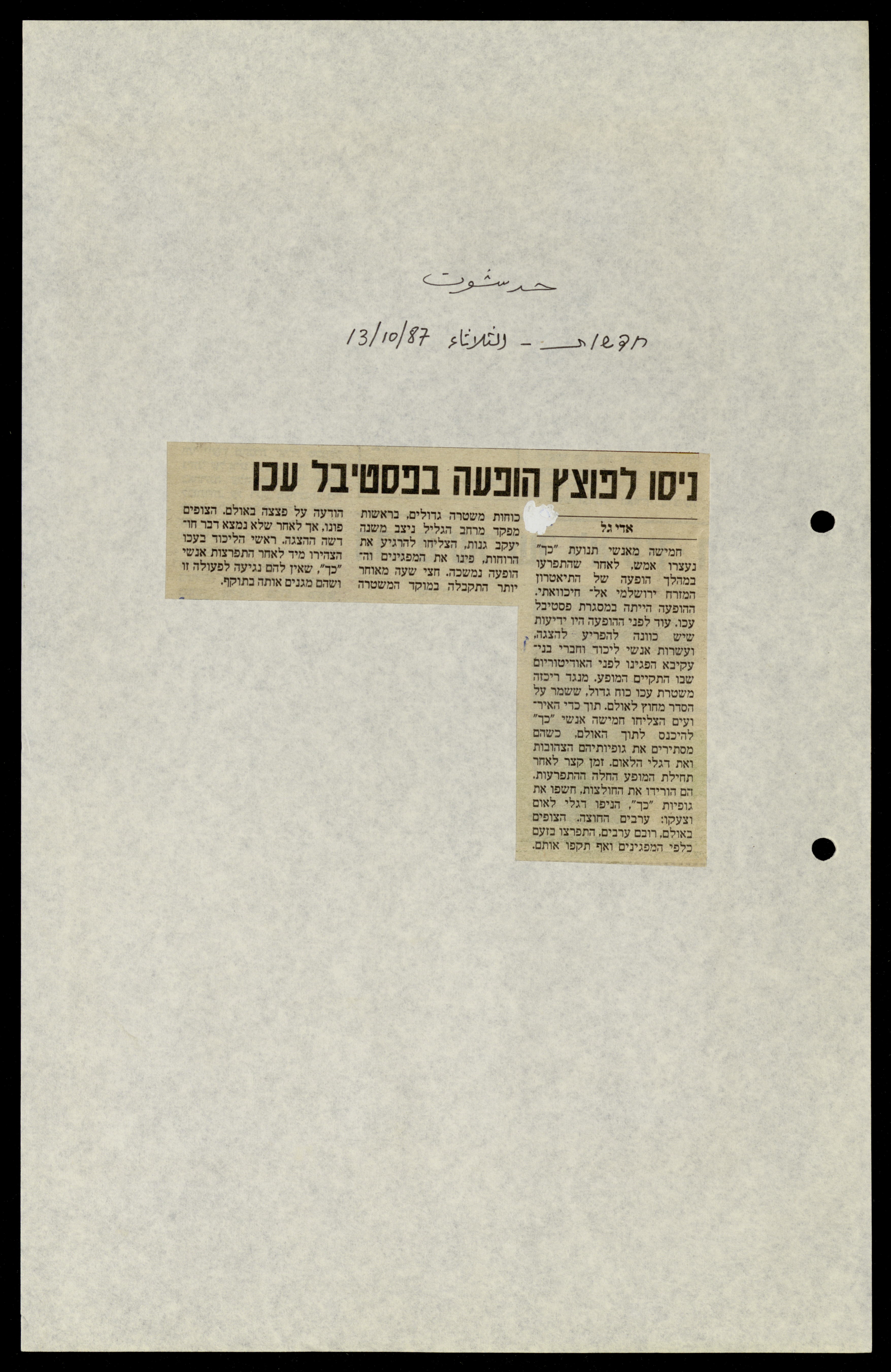 قصاصة من جريدة "حدشوت" العبرية، تحتوي على خبر صحفي يتحدث عن اعتقال خمسة أفراد من حركة "كاخ" اليمينية المتشددة، بعد اعتدائهم على أعضاء من مسرح الحكواتي وتخريب عرض فني لهم خلال فعاليات مهرجان عكا.