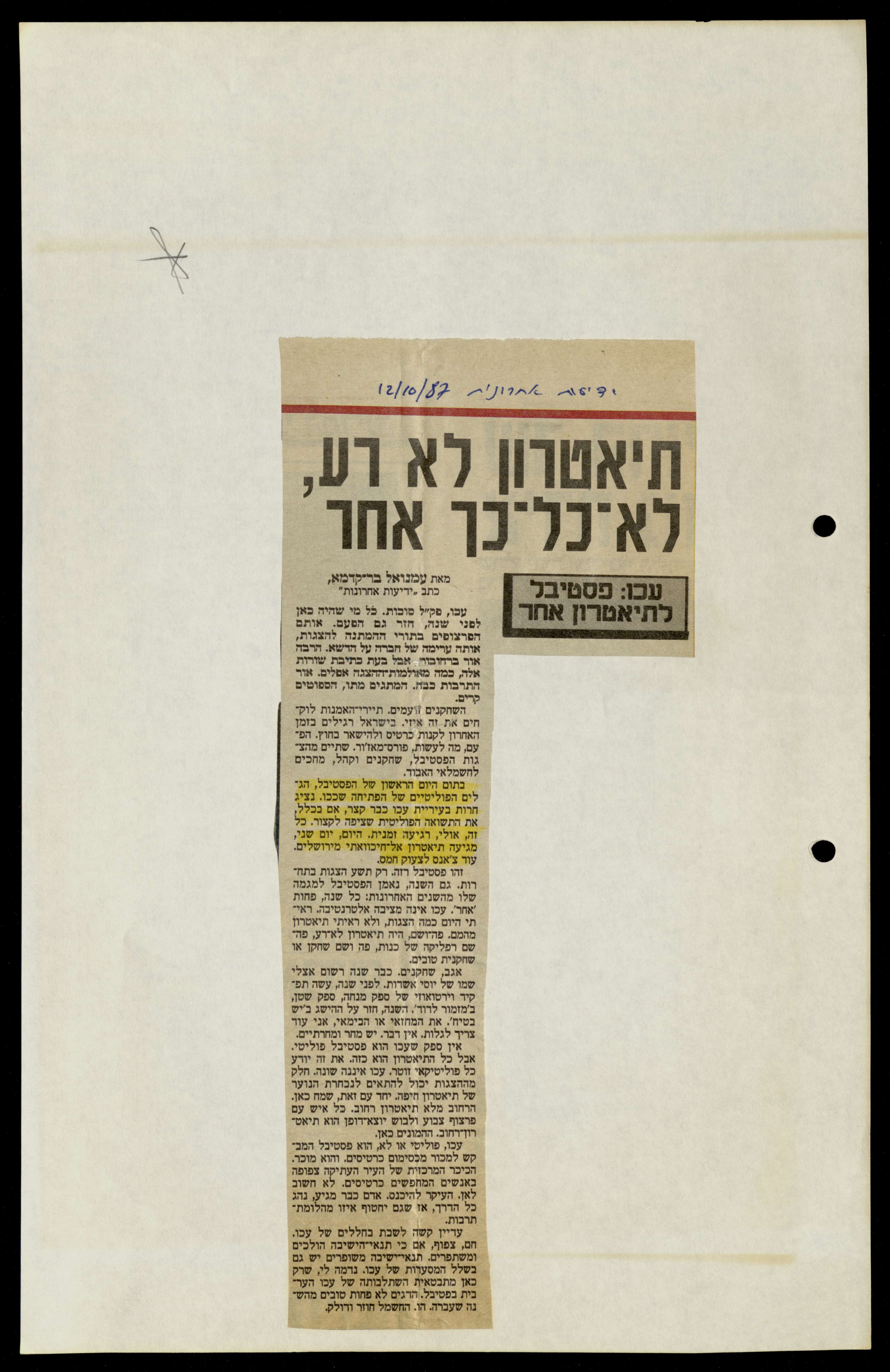 قصاصة من جريدة "يديعوت أحرنوت" العبرية، يتحدث عن مششاركة مسرح الحكواتي في مهرجان عكا.