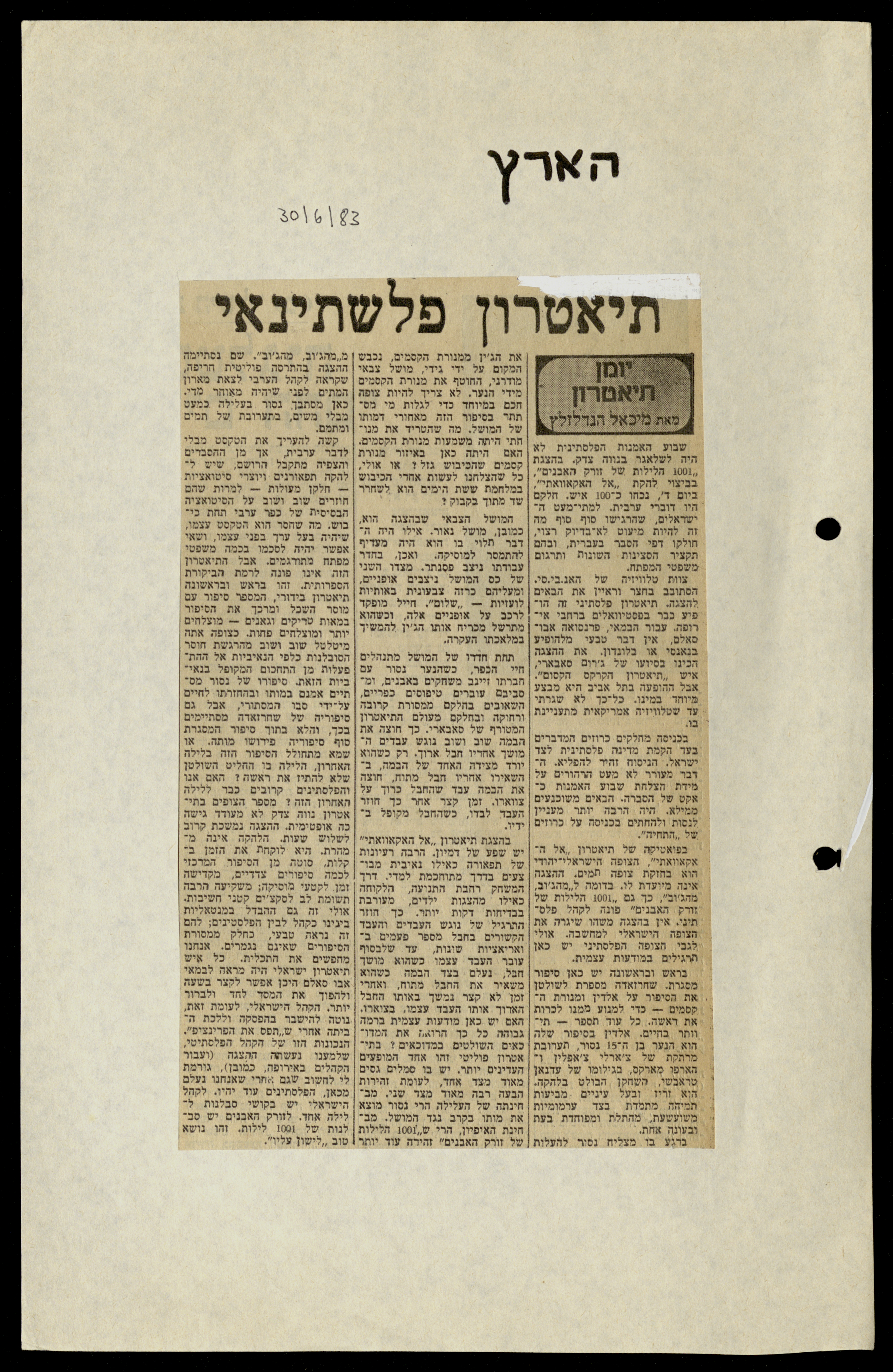قصاصة من جريدة "هآرتس" العبرية، تحتوي على تقرير صحفي بعنوان "مسرح فلسطيني"، يتحدث عن مسرح الحكواتي.