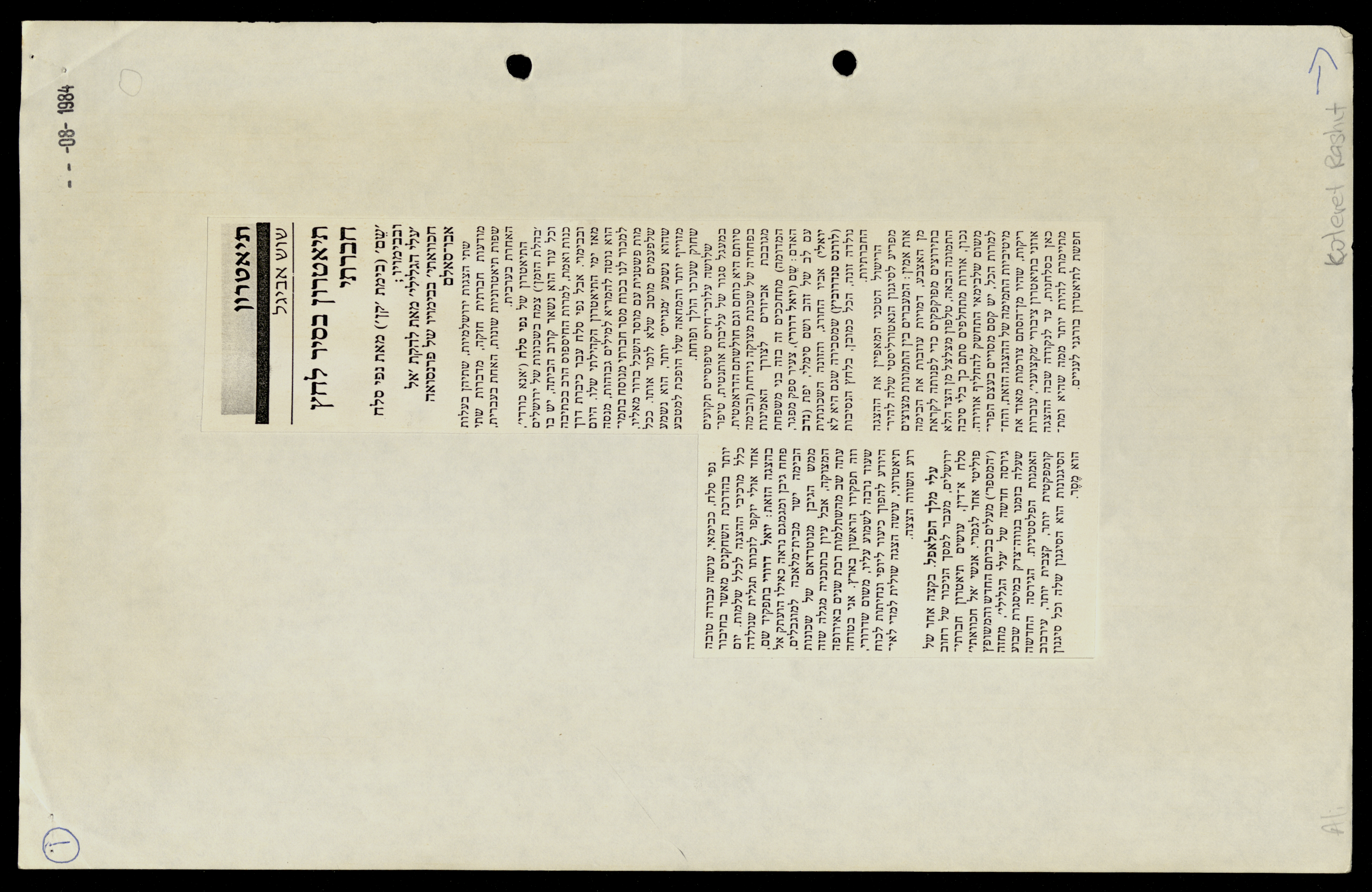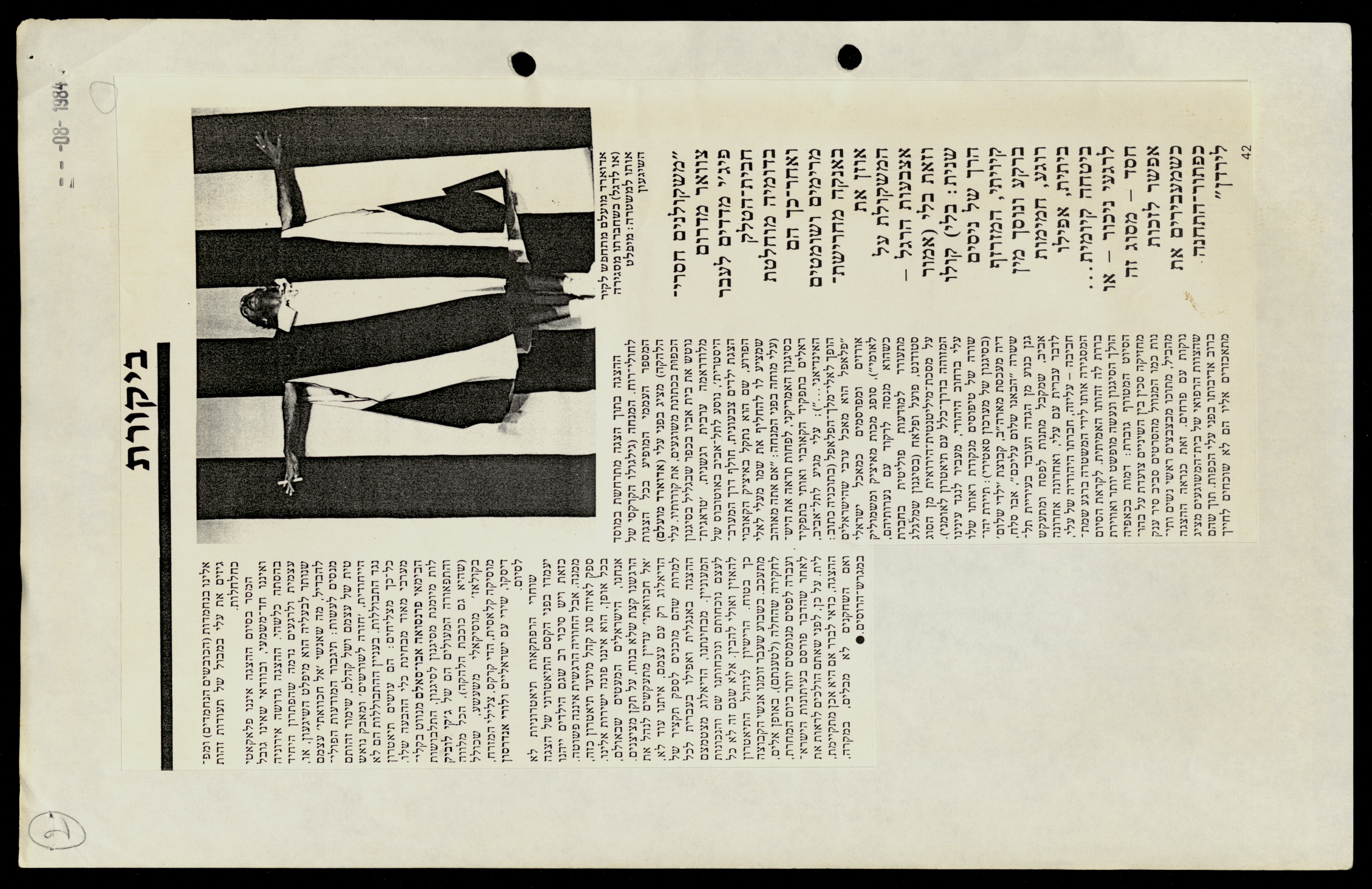 قصاصة من جريدة بالعبرية، تحتوي على تقرير صحفي يتحدث عن مسرح الحكواتي.