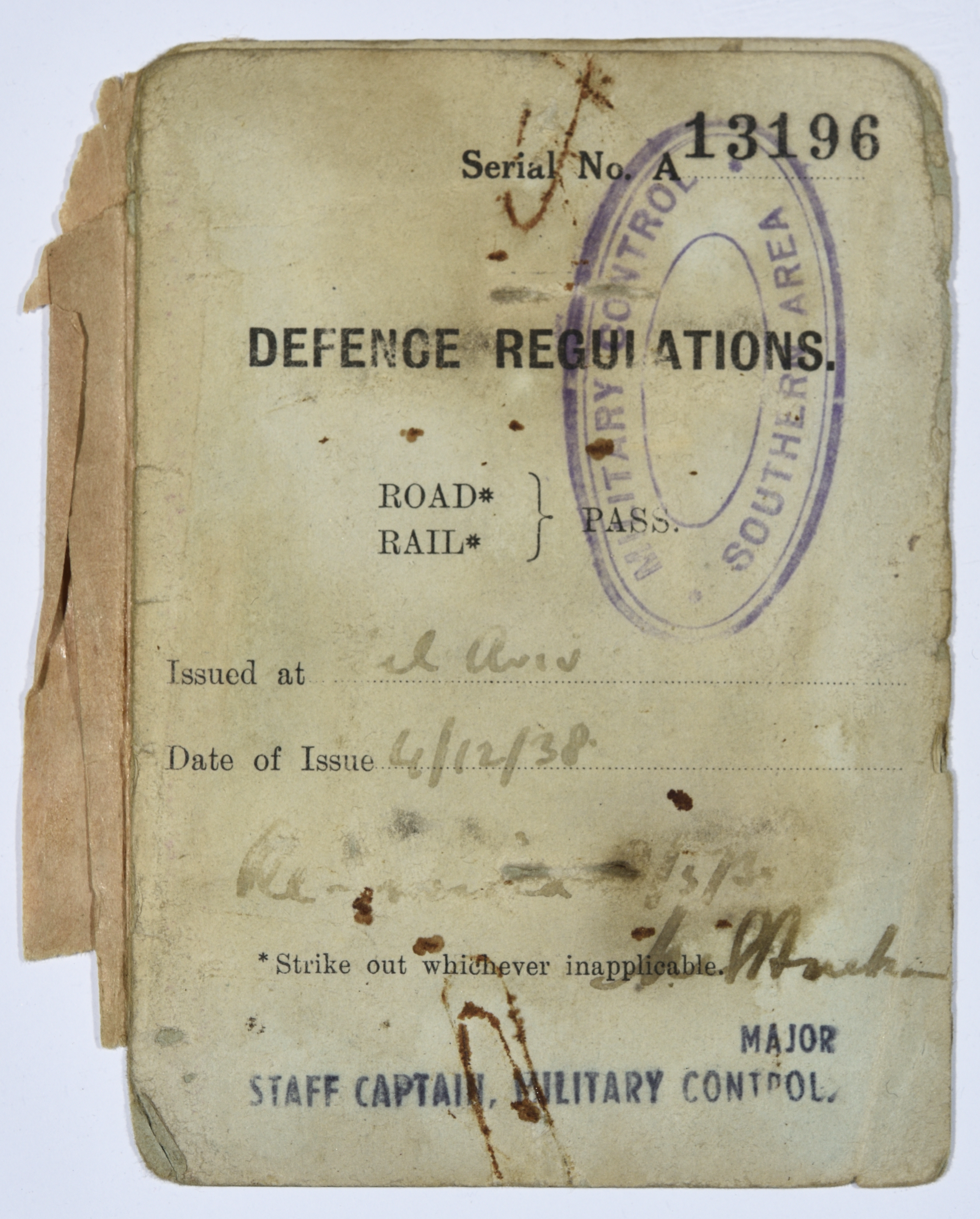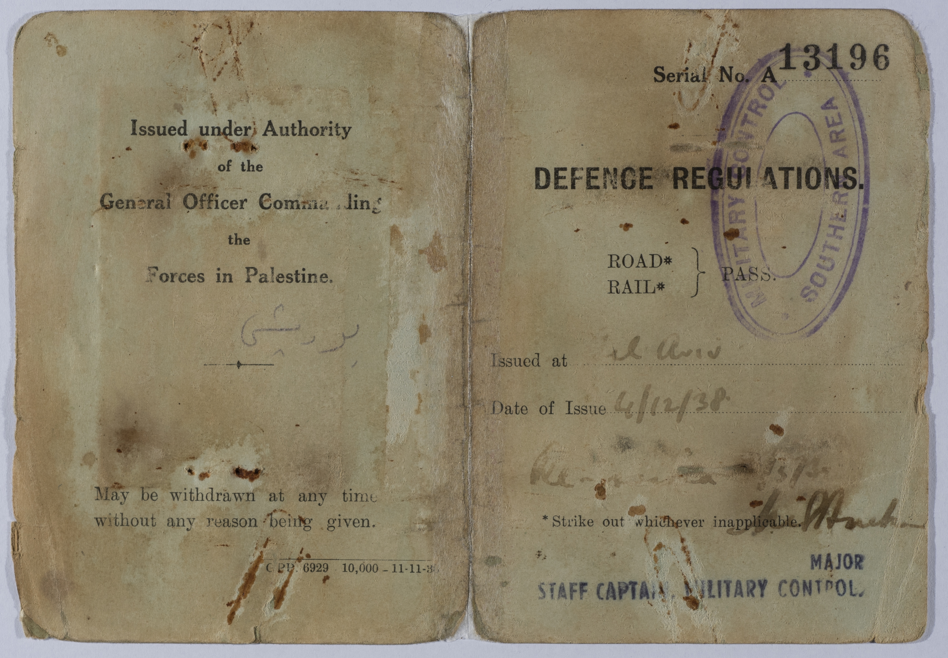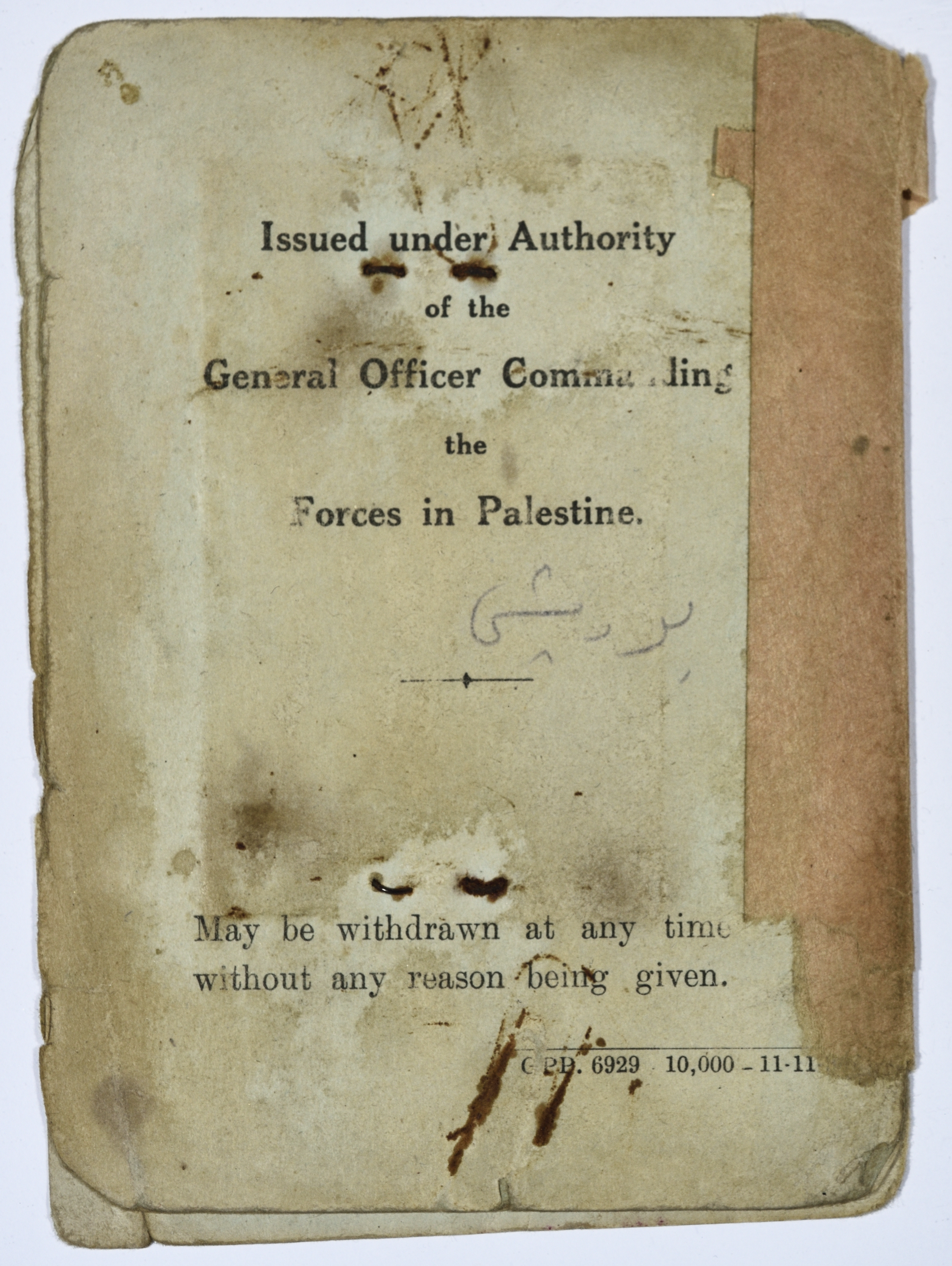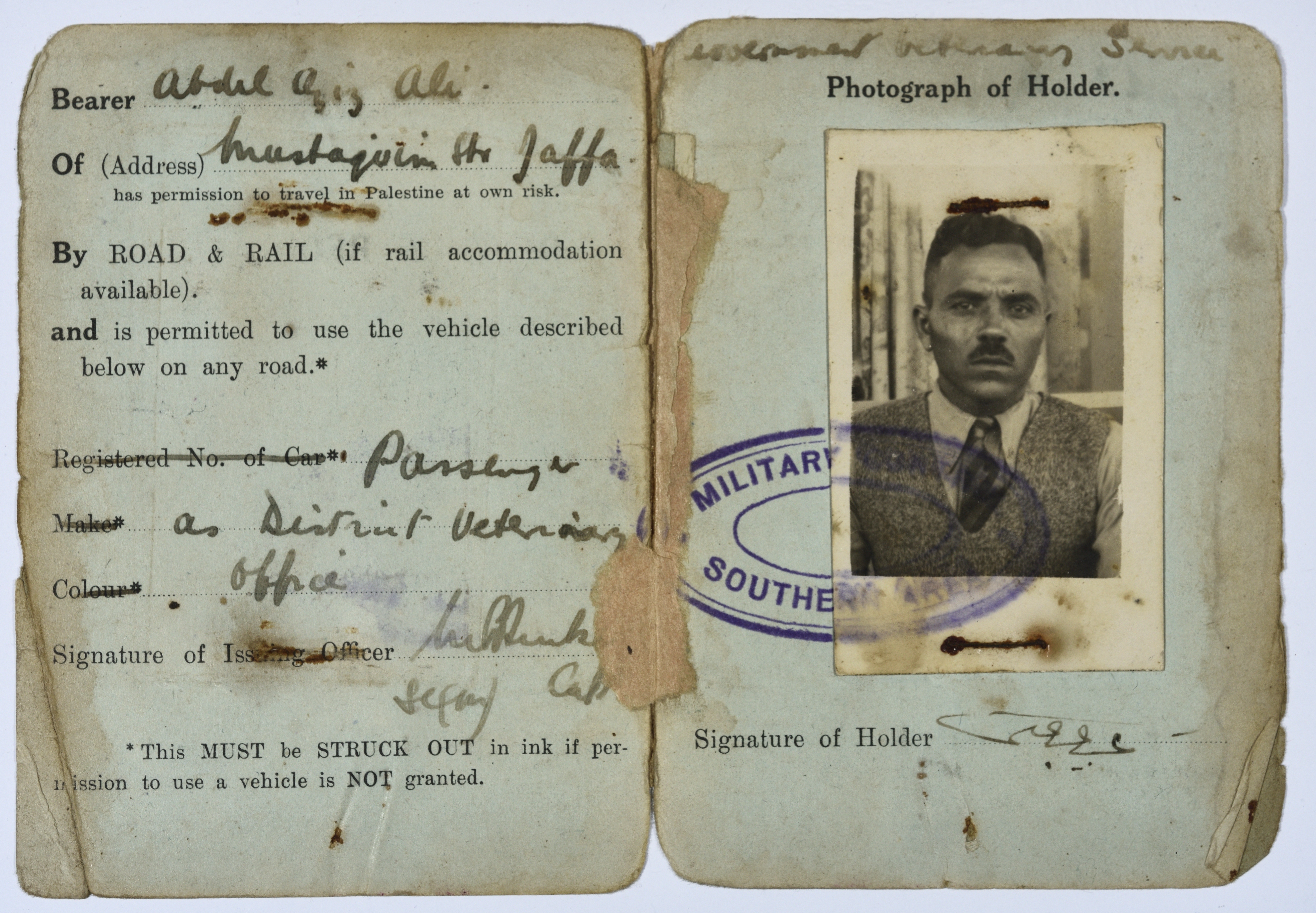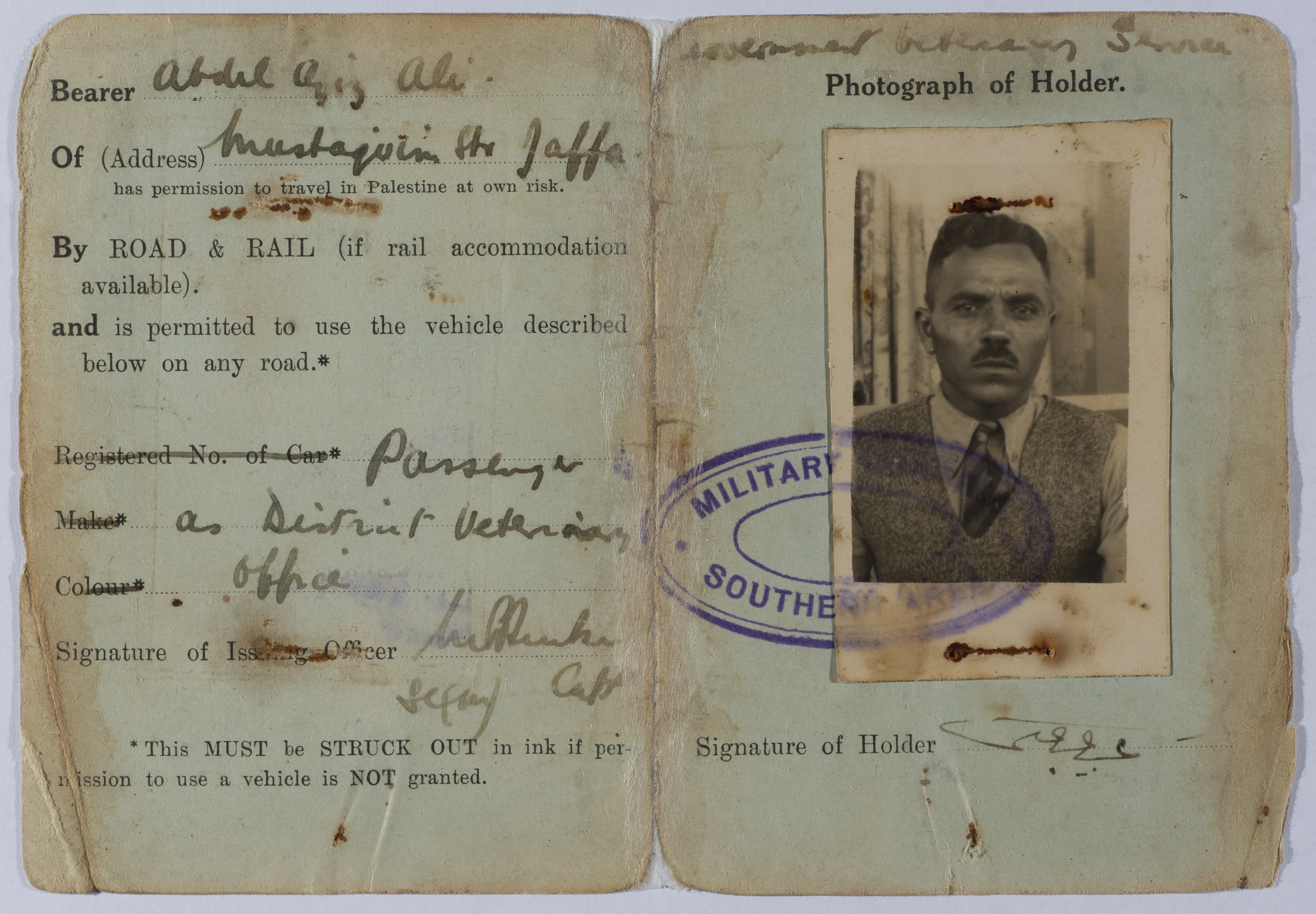 وثيقة صادرة في زمن الانتداب البريطاني على فلسطين، وهي عبارة عن رخصة قيادة خاصة بالسيد عبد العزيز علي حسين، كتب عليها تاريخ صدورها وهو الموافق 4/12/1938 وكانت قد صدرت في "تل أبيب" ويوجد على الرخصة ختم قيادة الجيش البريطاني في منطة شمال فلسطين