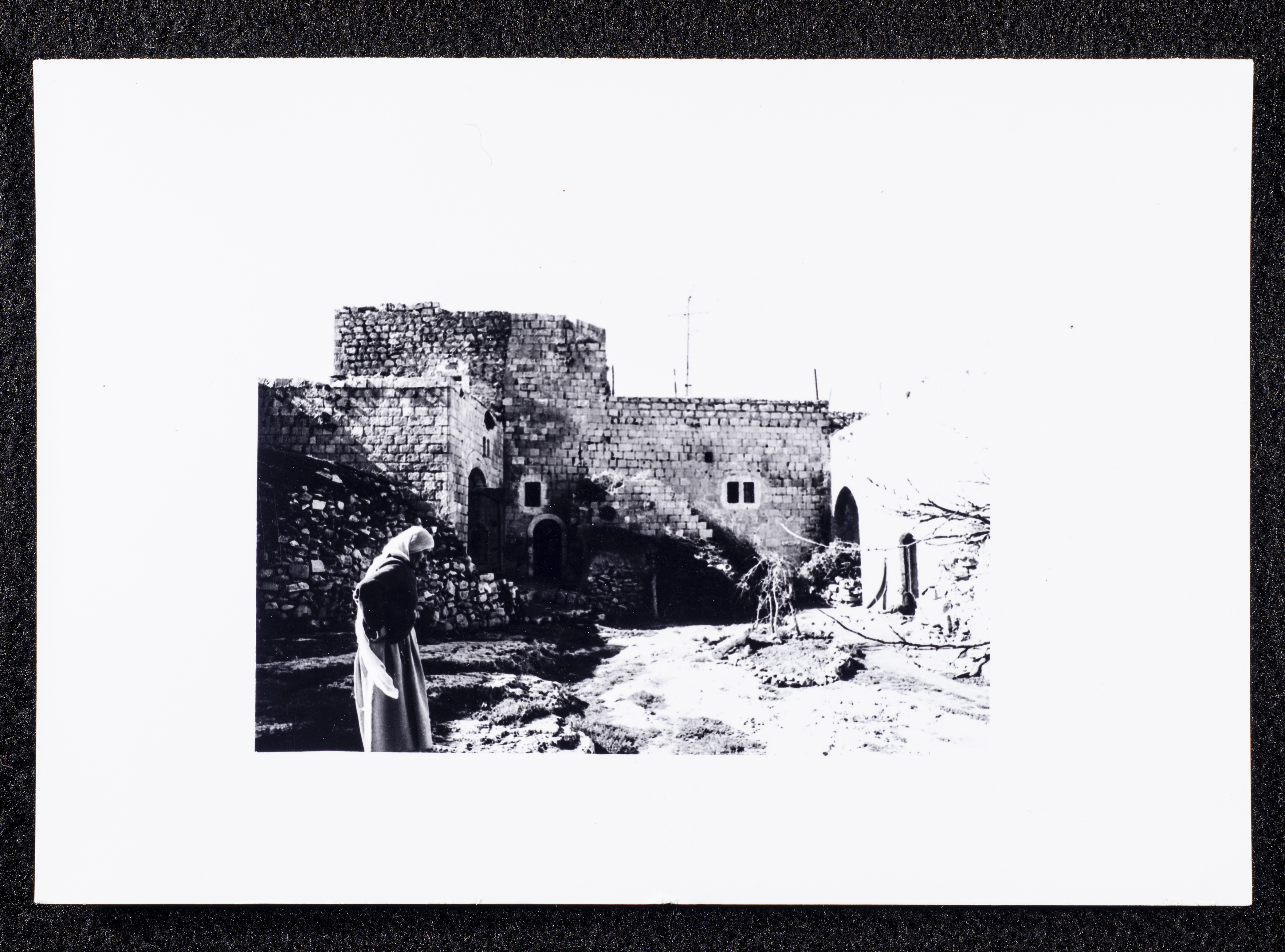 This black-and-white photograph captures a glimpse of the village of Dayr Ghassana.