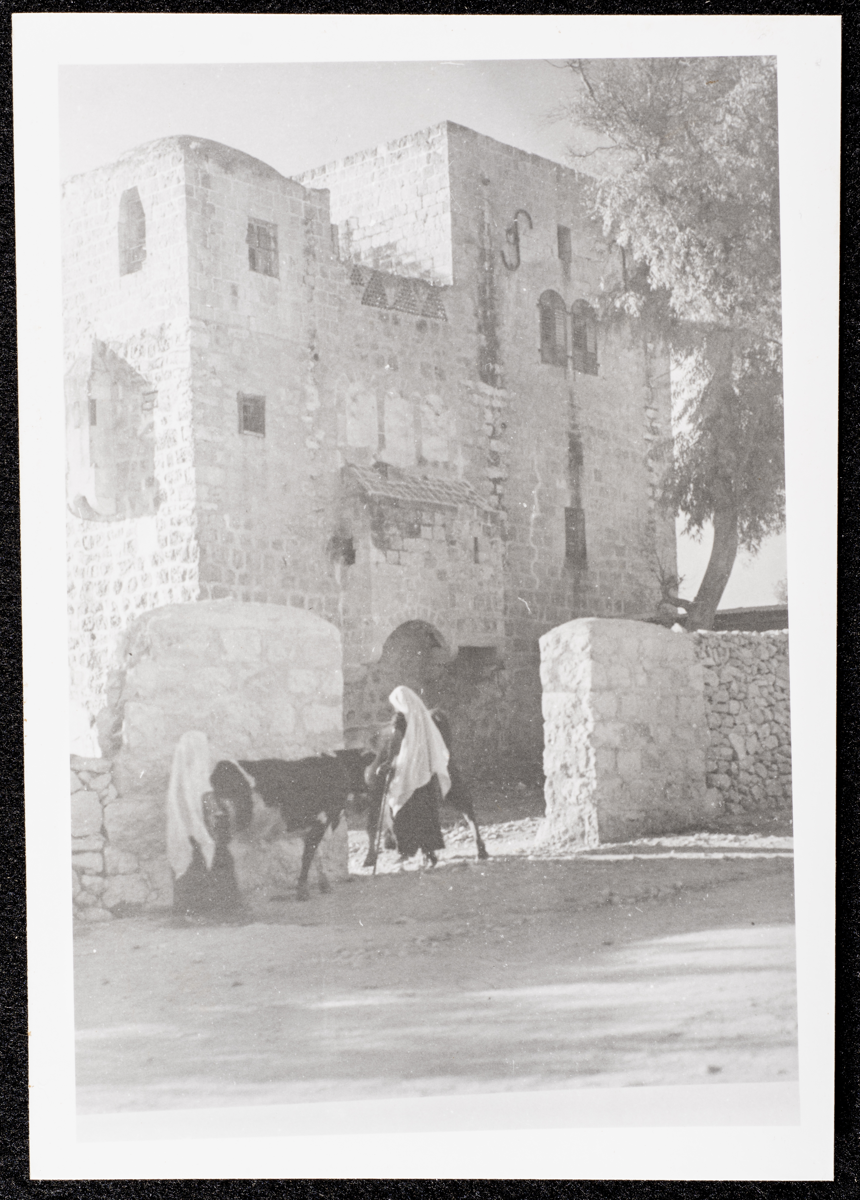 This black-and-white photograph captures a glimpse of the village of Dayr Ghassana.