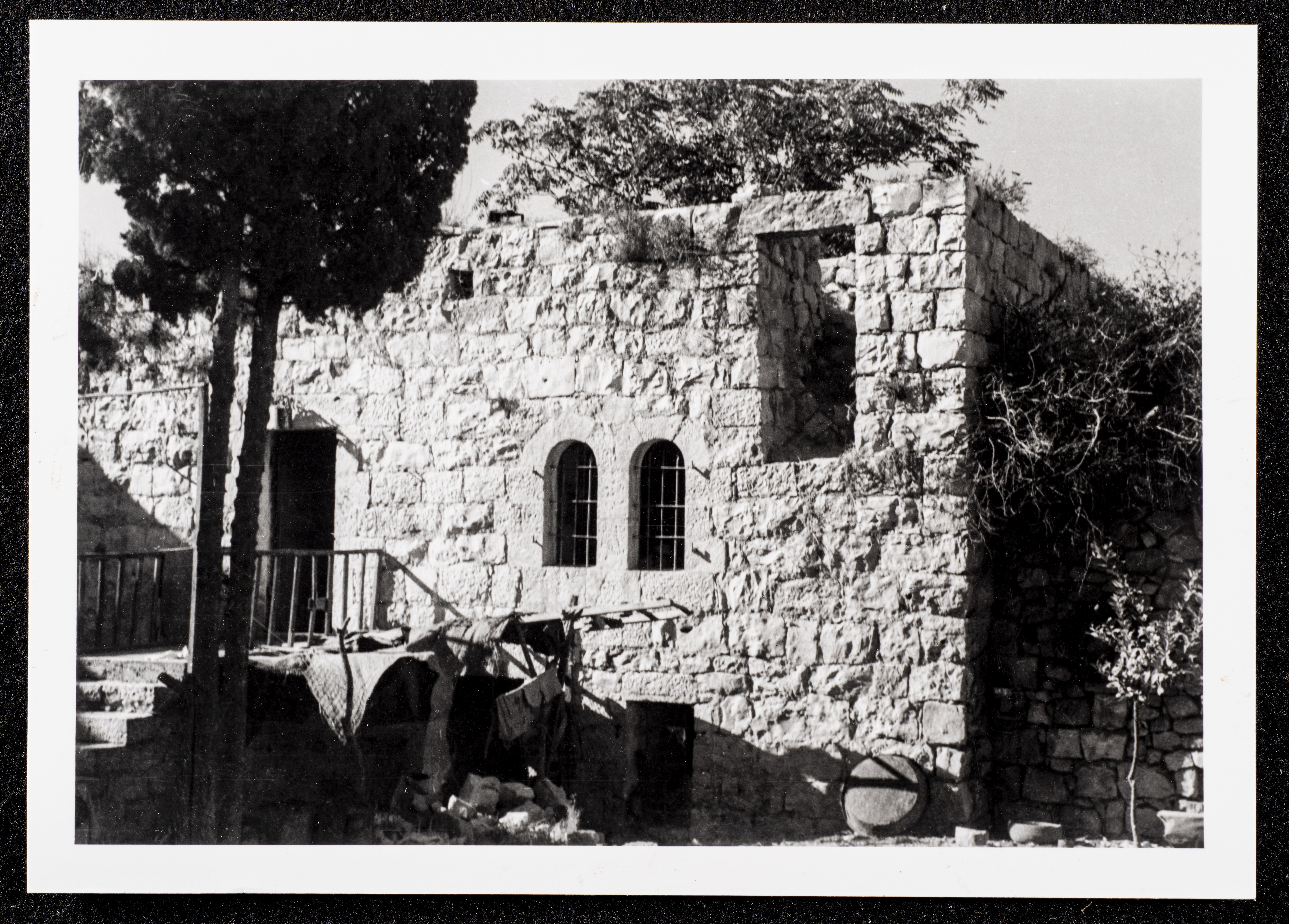 This black-and-white photograph captures a glimpse of the village of Dayr Ghassana.