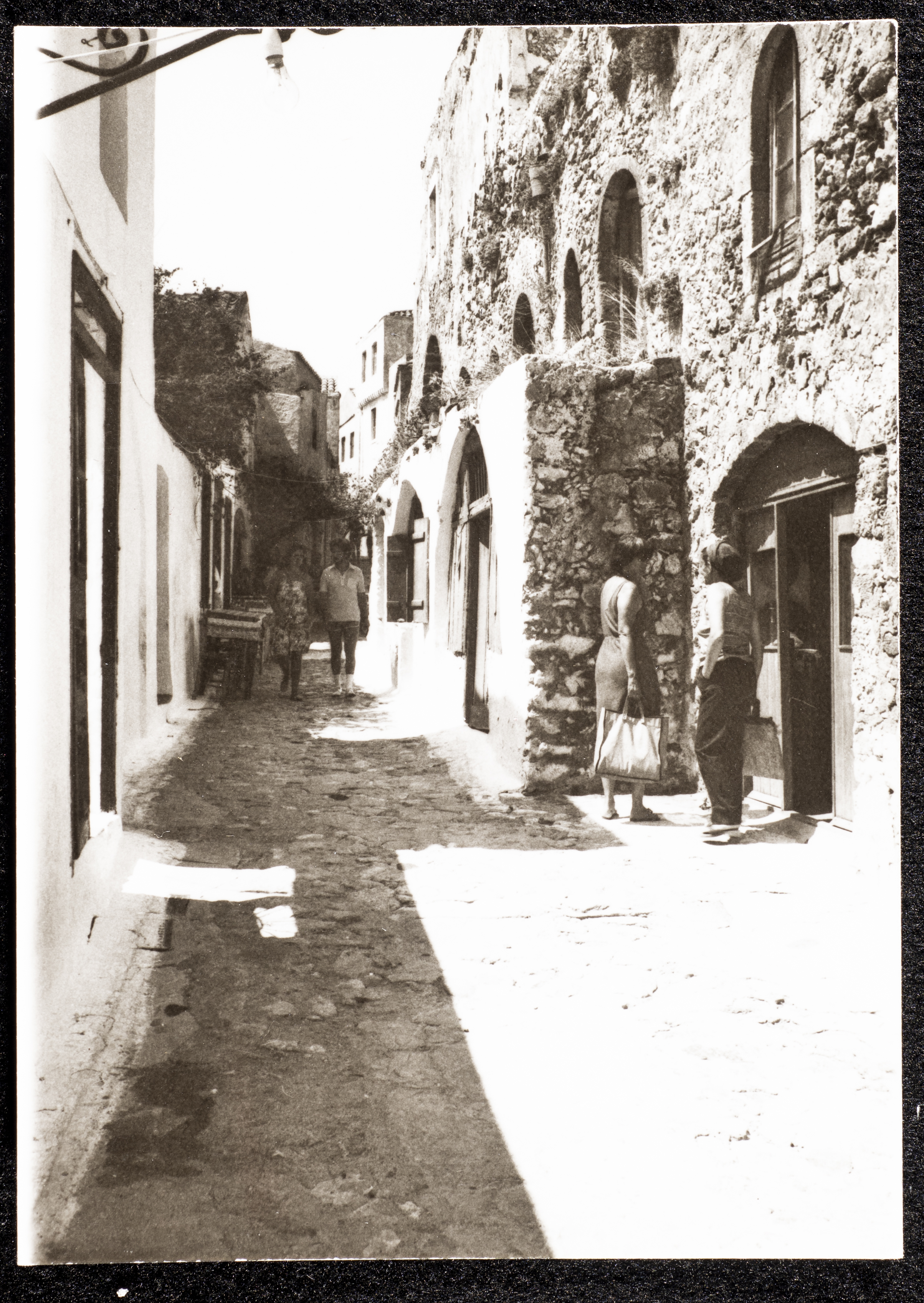 Taken in 1981, this black-and-white photograph shows a glimpse of old houses on a mountain in Greece.
