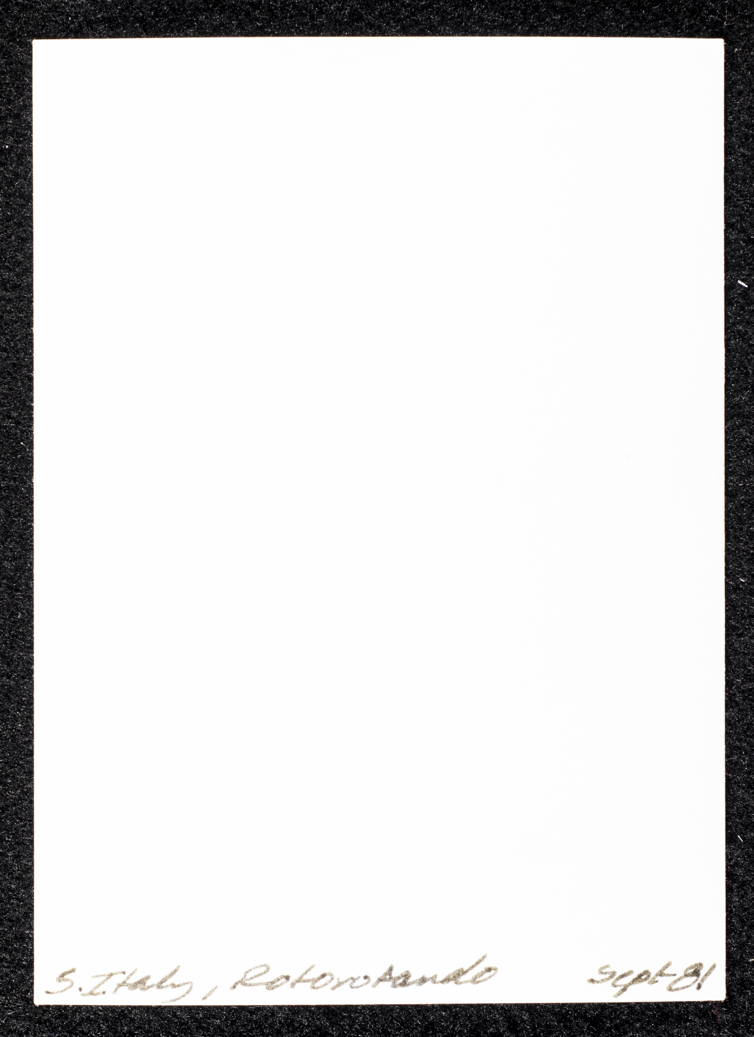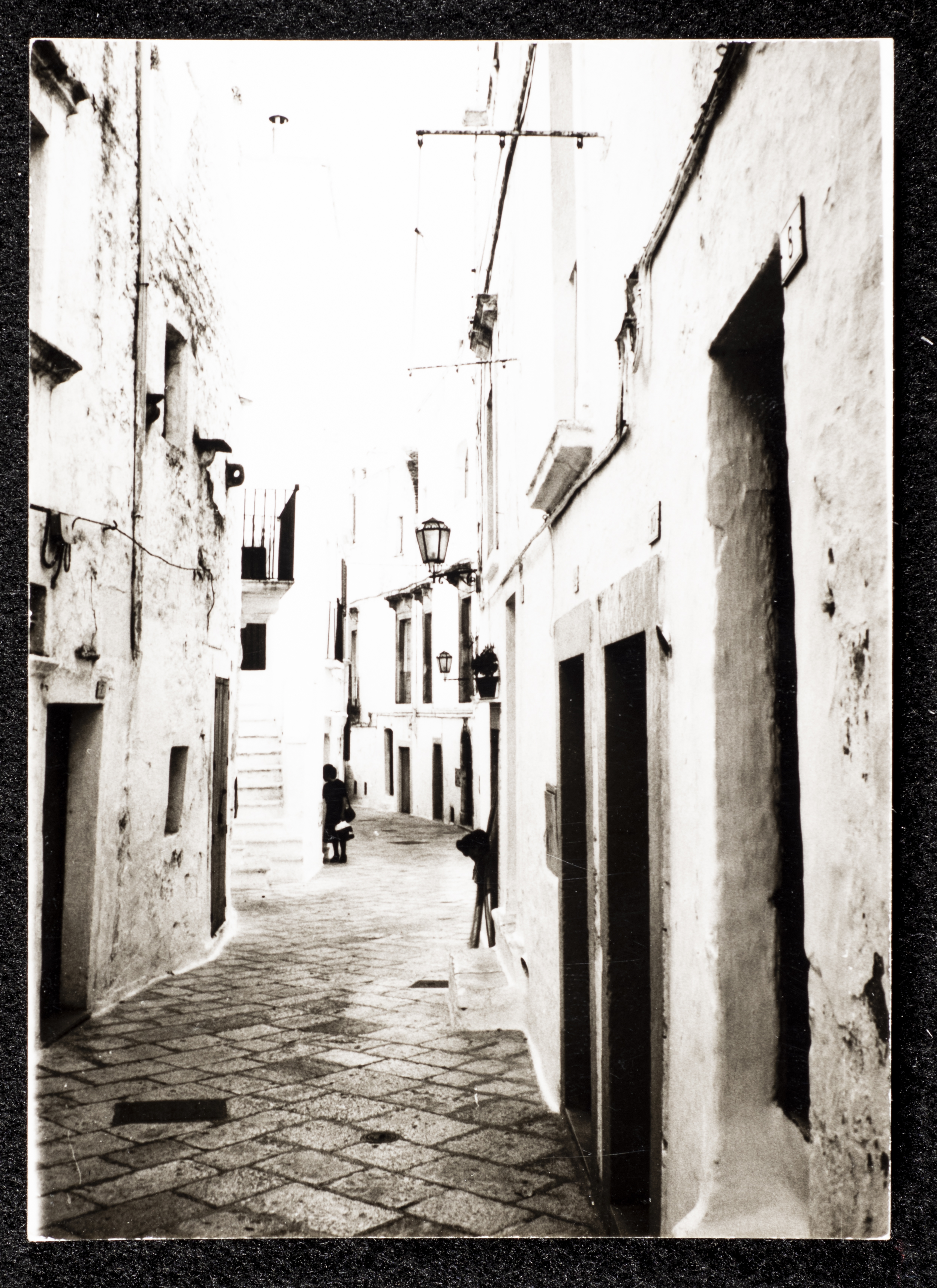 Taken in September 1981, this black-and-white photograph captures a row of trullo houses with a conical roof in Monte Pertica street in Alberobello, Italy.