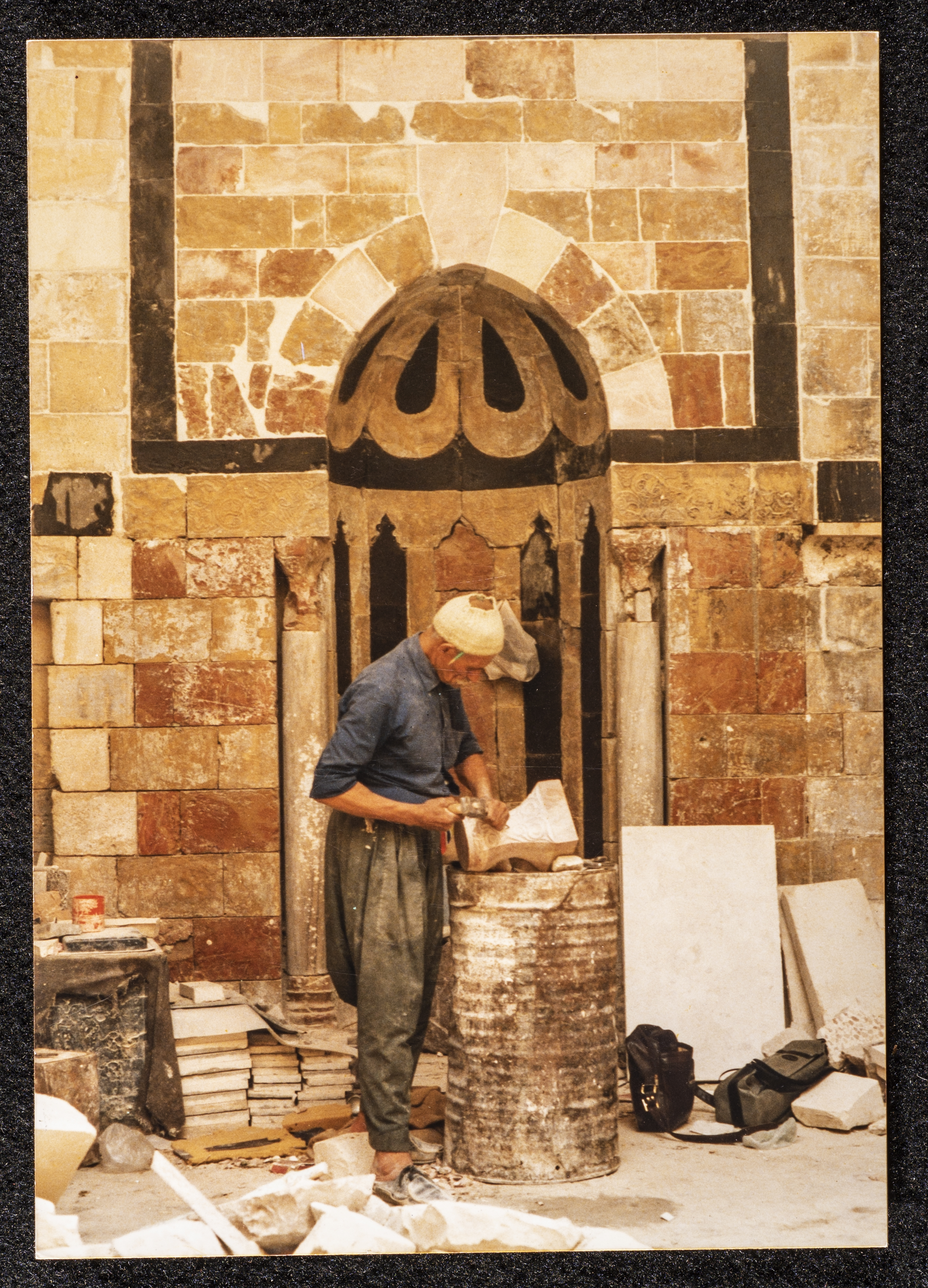 صورة توثق قيام رجل بحرفة دق الحجر في إحدى ساحات الحرم الشريف في القدس، يظهر فيها محراب إحدى المدارس المملوكية.