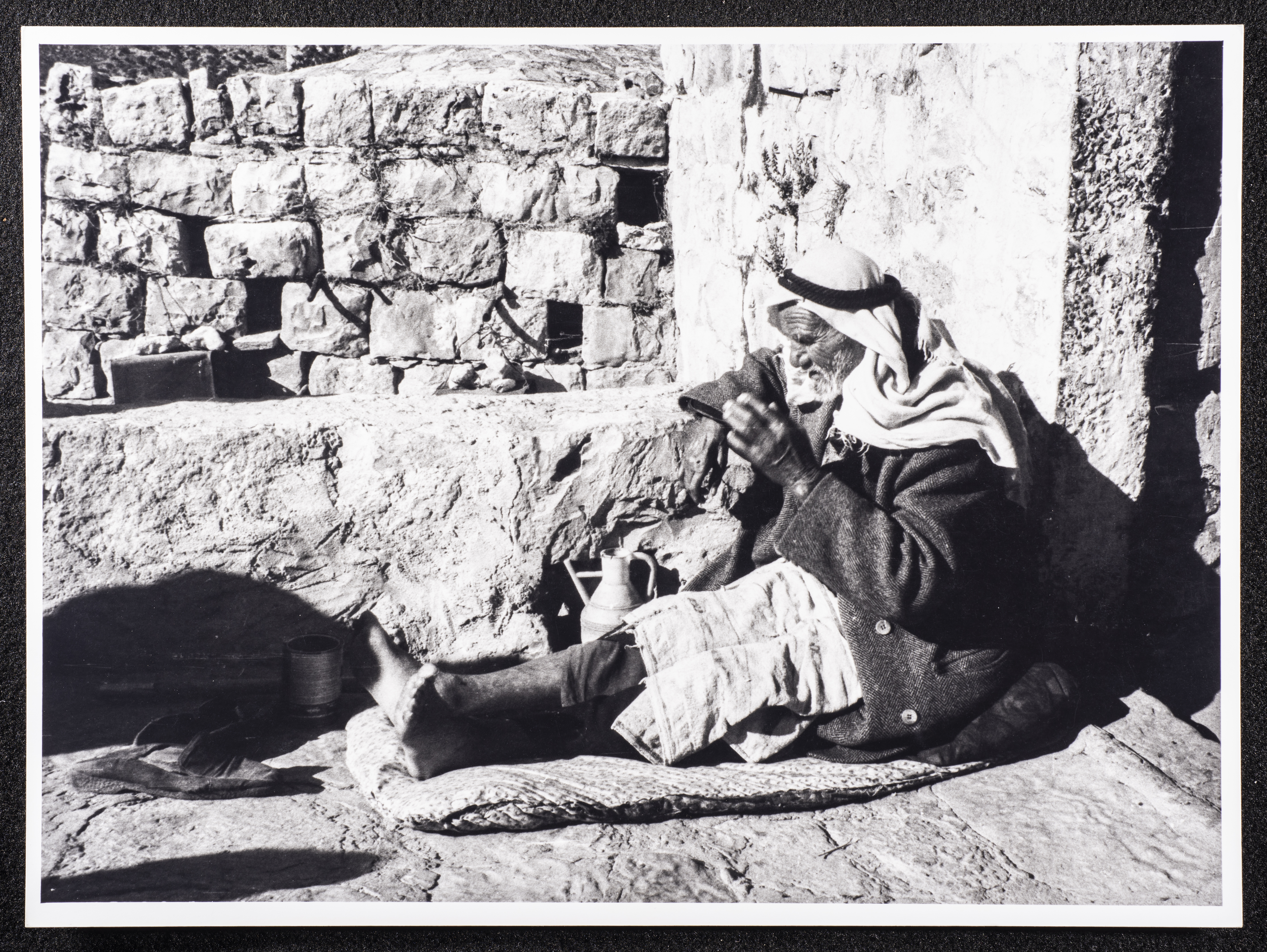 صورة لمشهد عام من قرية خربة ابو فلاح قضاء مدينة رام الله، يظهر فيها رجل مسن من امام احد البيوت القديمة.
