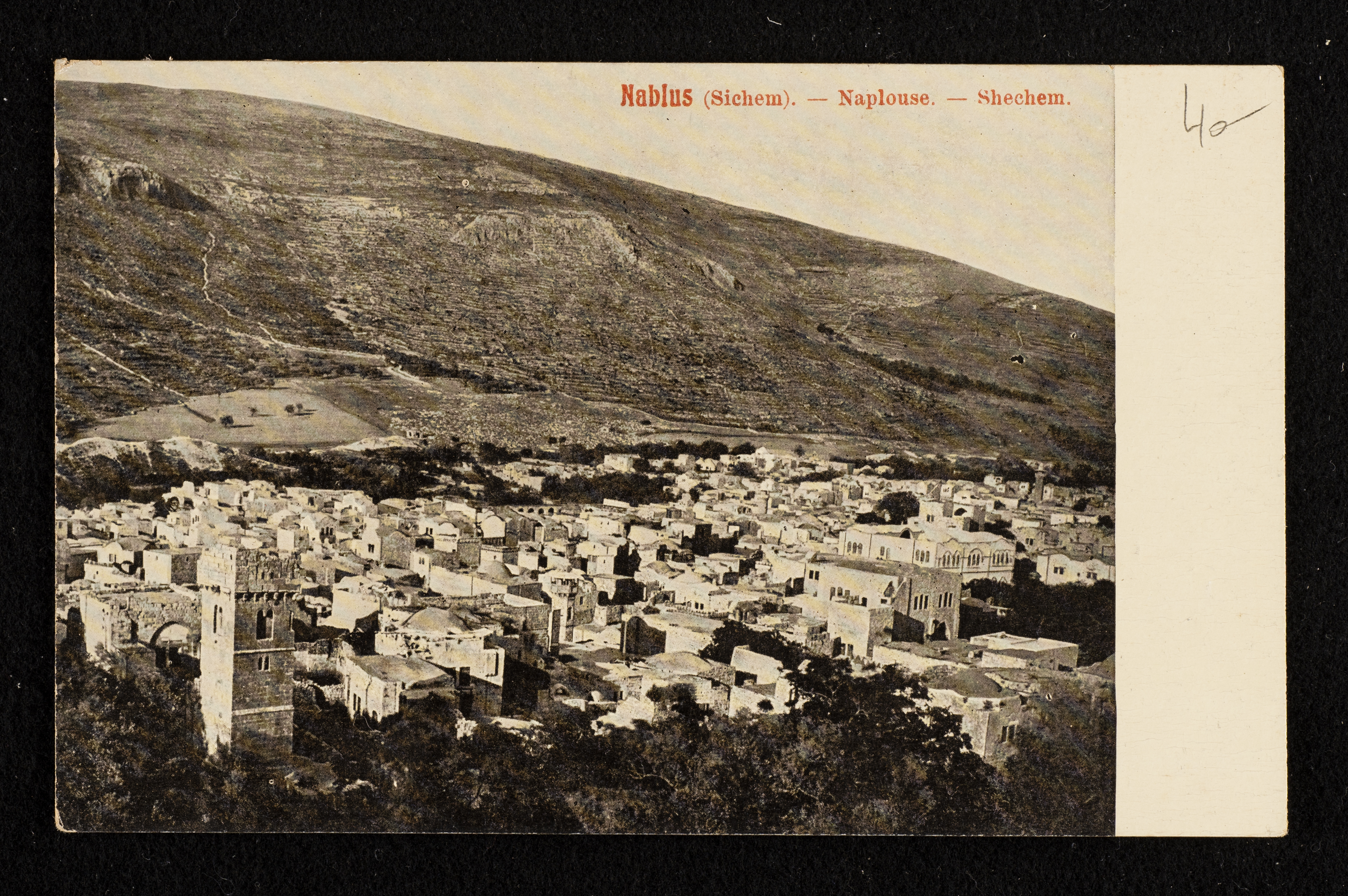 A black-and-white postcard of Israeli-occupied Nablus, taken from Suʿad al-ʿĀmery's archive.