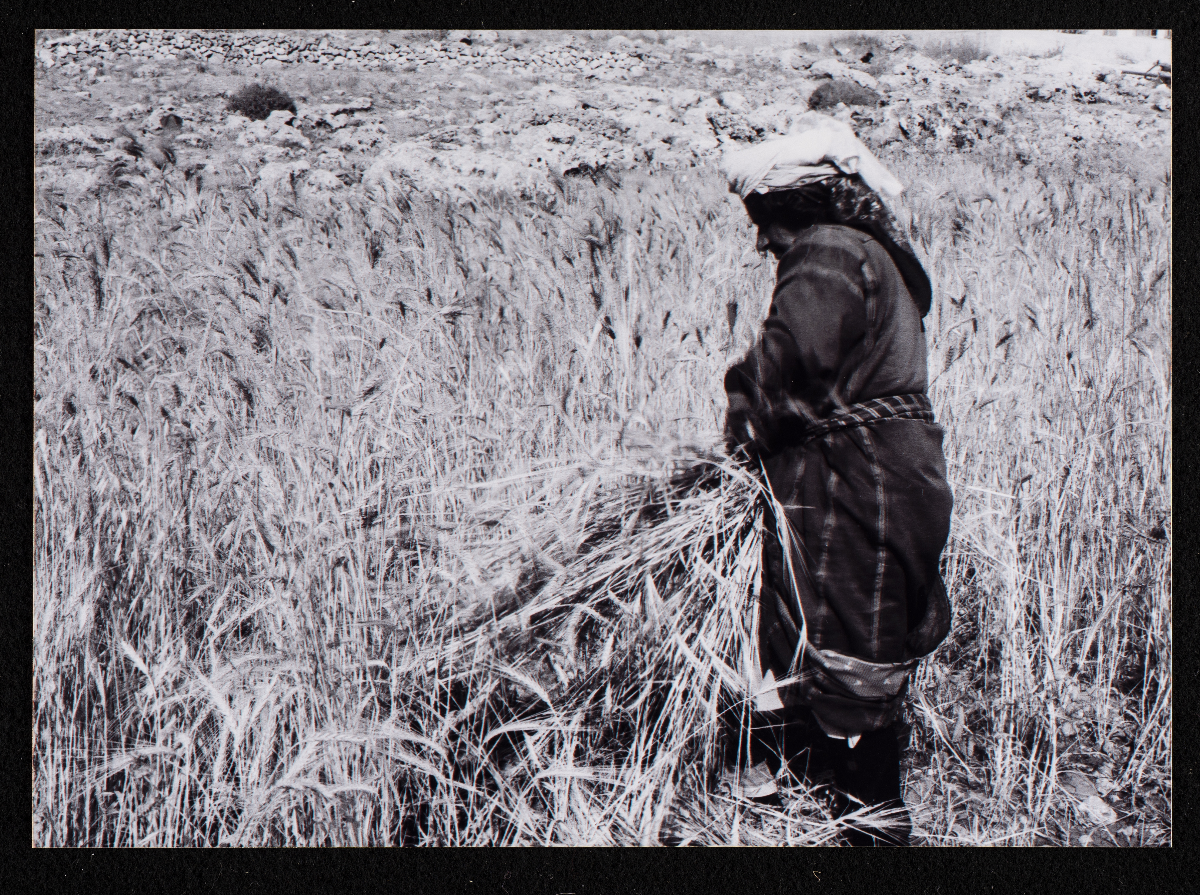 صورة غير ملونة ترصد جانبًا من أحد مواسم حصاد القمح في ميدنة البيرة المحتلة.
